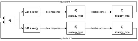 Apart from the fact that we have to explore both C/D and D/C strategies, the double game algorithm is very similar to the DGPD algorithm. For each type space interval of agent 1, we compute the best response of agent 2 and the best response of agent 1 given the latter. We check that we fall back to the initial strategy by ensuring that the thresholds are in the same interval and that the strategy types are the same. Of course, we cannot benefit from the reduced search space with and as they make no sense in the general context. The overall procedure is summarized in Figure 12.