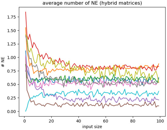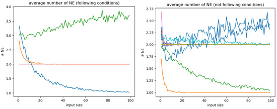 Next, using a modified version of the NE search that does not stop at the first solution (if it exists) we computed the average number of solutions for different type space configurations. Let input size denote the number of elements in the type space for both players. In this context, and .