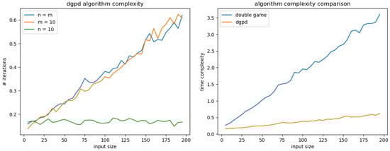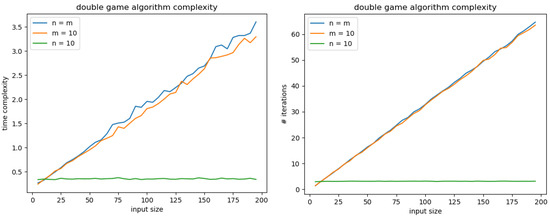 First of all, the left part of Figure 15 displays the complexity of DGPD NE search for different variations of inputs. When , both input sizes vary, while when or only input size varies. Notice that when the first agent’s input size is constant, the complexity is also constant. When n varies, the complexity is linear and is almost independent of whether m varies or not. In fact, the main driver of the complexity is the main loop that iterates over the elements of . The procedure finder() has a low computational cost as it comprises a binary search. In practice, for imbalanced type space size, one should always consider the agent having the smallest type space as the first agent.