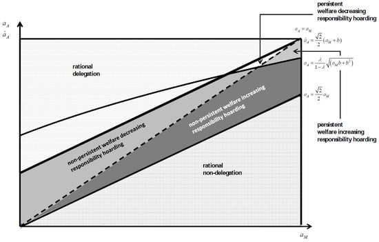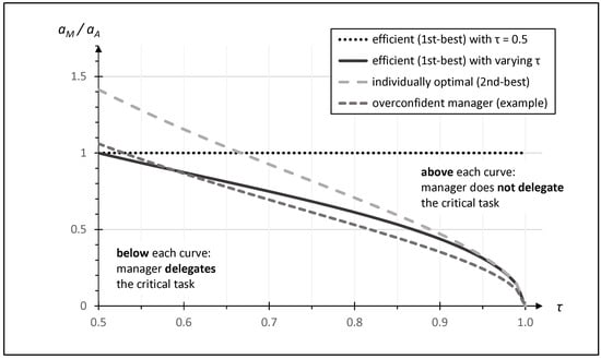 Given our analyses so far, it seems clear that the manager’s allocation decision depends both on the relationship between the manager’s and the agent’s abilities, i.e., on the ratio /, and on the distribution of payoffs between them, i.e., on . Figure 1 shows the relationship between the ratio of abilities, the payoff distribution, and the manager’s delegation choice. The dotted horizontal line indicates that in the first-best setting with equal costs and payoff shares, the critical task should always be performed by the actor with the greater ability, i.e., by the manager for > and by the agent for < . In the other cases, as we have discussed above, the delegation choice depends both on the ratio of the abilities and on the distribution of payoffs. The rational manager maximizing mutual utilities (i.e., efficient (first-best) with varying ) delegates the critical task when the parameter combination lies under the solid curve, and the rational manager maximizing their own utility only (i.e., individually optimal (second-best)) delegates when the parameter combination lies under the wide-dashed curve. Clearly, for any given , the rational manager is less likely to delegate the critical task when making a first-best decision and more likely to delegate when making an individually optimal (second-best) decision.