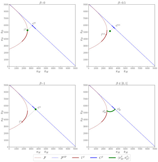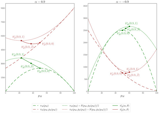When , the expected payoffs coincide with the conflict profits, and the equilibrium values coincide with the non-cooperative ones. As increases, according to (9) and (10), seller M and D reduce their price when , and they increase it when . Furthermore, as shown in the figure, when , the first-order effect on seller M’s conflict profit is zero, while it is negative for seller D. As increases, the conflict profit curve of seller D, which is initially steeper than that of seller M, flattens, and the difference in the reduction of conflict profits shrinks. Initially, this allows seller M to increase its own equilibrium expected payoff at seller D’s expense. Subsequently, both sellers’ expected profits increase with the likelihood of cooperation.