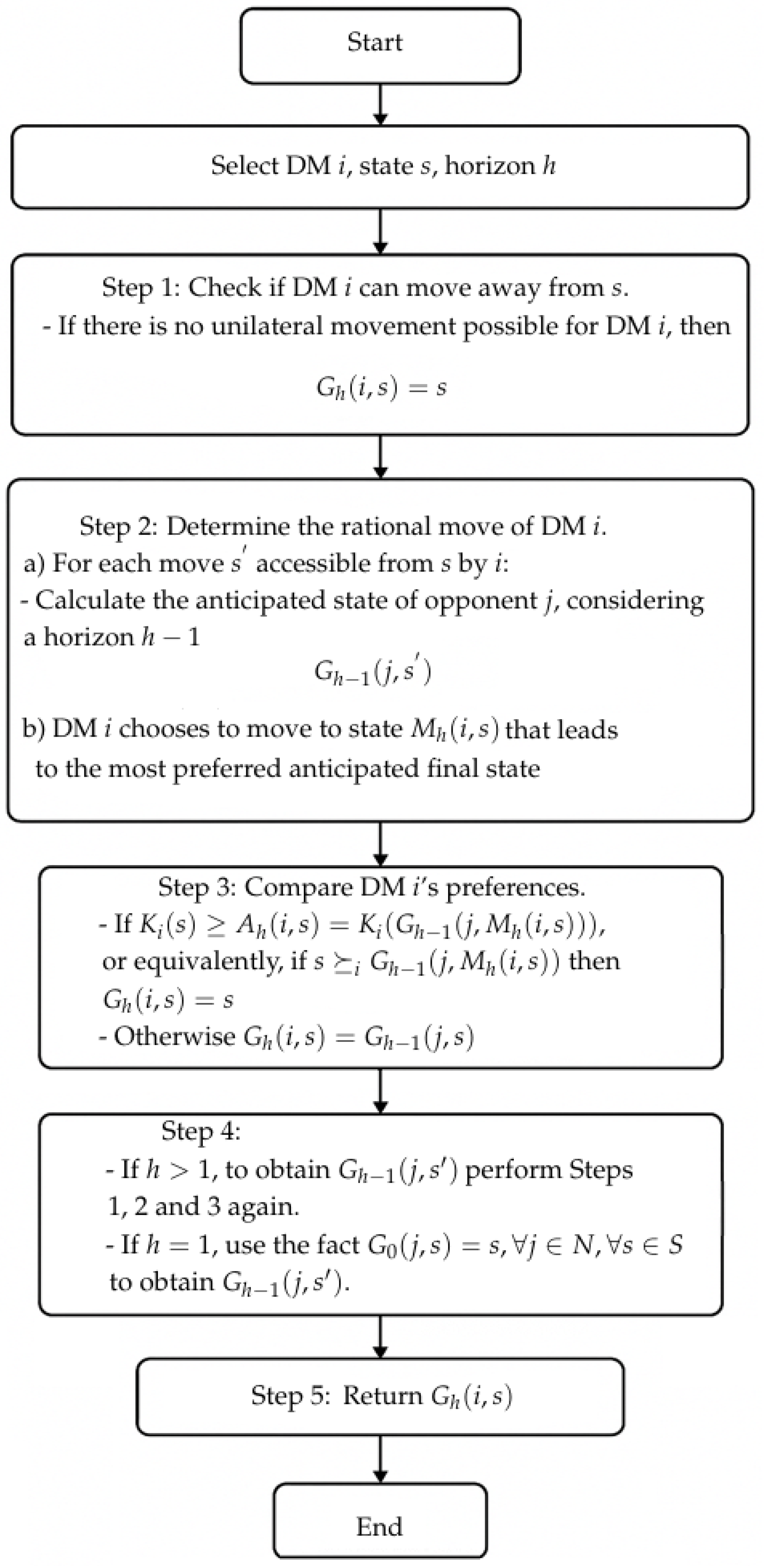 The notion of limited-move stability takes the positive integer h as a parameter, and assumes that the focal DM anticipates h steps into the future. This DM asks what the final state will be if all DMs make choices to achieve the best final scenario possible for themselves within the h-move horizon, assuming that the preferences of all DMs are common knowledge. Note that each DM’s choices depend only on his or her relative preferences for outcomes—information that is always available in the context of ordinal games.