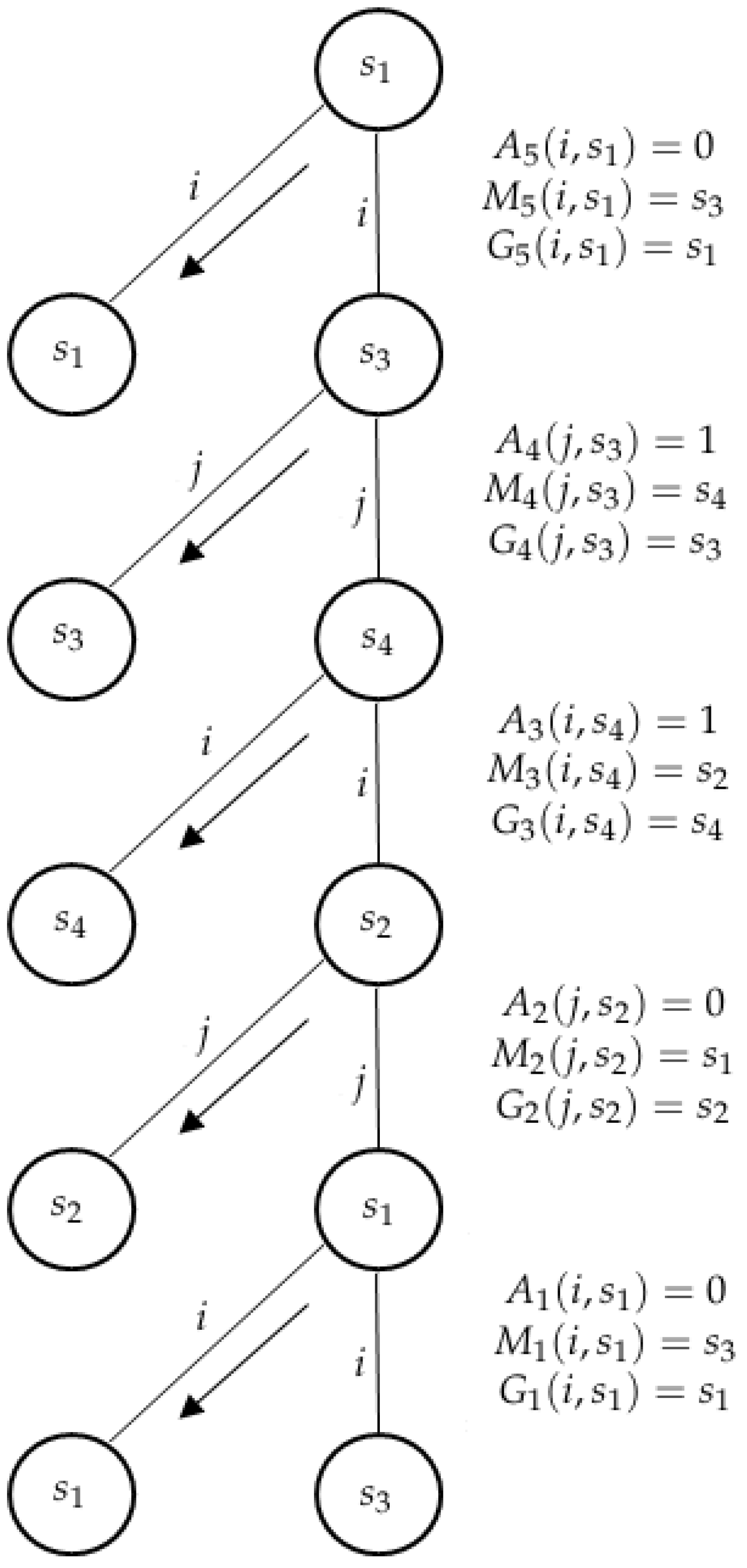 This game can be treated as a graph model. By convention, we will use and to represent the states of the cells in the first row and and to represent the states of the cells in the second row. We will call the DMs of this game DM i and DM j. Note that since DM i can alter their position in the conflict by switching rows, and DM j can do so by switching columns, the graph model representing this conflict, along with the DMs’ preferences over the conflict states, appears in Figure 2. Since this same convention is used for all games, it follows that, for any given , the sets and are the same in all games. Consequently, for any given , the value of the function is the same for every horizon and every game, as it can be seen in the tables of Examples 1 and 2. For didactic purposes, before studying the problem of cycles in this example, we illustrate how to analyze the limited-move stability of state for DM i considering a horizon . Figure 3 displays a tree with all sequence of alternate moves that DMs i and j can make starting from a move of DM i from state and considering at most five moves in the sequence. To obtain the anticipate the final state , we need to analyze first the final moves of the DMs. In this example, the final move that can be made is a move from DM i considering horizon 1 from state . Since , it follows that and . As , we have that . Moving one step above, from state , DM j can only move to and anticipates that the conflict will end in because . Thus, it follows that and . As , it follows that . Continuing one more step above in the tree, from state , DM i can only move to and anticipates that the conflict will end in because . Thus, it follows that and . As , it follows that . Going one more step above in the tree, we have that, from state , DM j can only move to and anticipates that the conflict will end in because . Thus, it follows that and . As , it follows that . Finally, at the initial move of DM i from , we have that DM i can only move to and anticipates that the conflict will end in because . Thus, it follows that and . As , it follows that , which implies that state is stable for DM i. We will use the procedure described above to analyze the stability of the states for values . Considering , we present in Table 2 the results of the stability analysis for both DMs of the conflict. Note that states and are stable for DM i and states and are stable for DM j. Considering now , Table 3 presents the results of the stability analysis for DMs i and j. Note that states , , and are stable for DM i and states , , and are stable for DM j. Now, considering , Table 4 presents the results of the stability for DMs i and j. We have that states , , and are stable for DM i, while states and are stable for DM j. Considering , Table 5 presents the results of the stability for i and j. Note that , , and are stable for DM i, while states , , and are stable for DM j. Note also that this is the same result obtained in the stability analysis. Considering now , Table 6 presents the results of the stability for DMs i and j. We have that states and and are stable for DM i, while states and are stable for DM j. Note also that this is the same result obtained in the stability analysis. From the tables, we can see that, starting at horizon , the BaCo game enters a cycle of length 2, i.e., the state anticipated by DM i (resp., DM j), from a state , considering that a horizon is the same state anticipated, from s, considering a horizon t, for every integer .