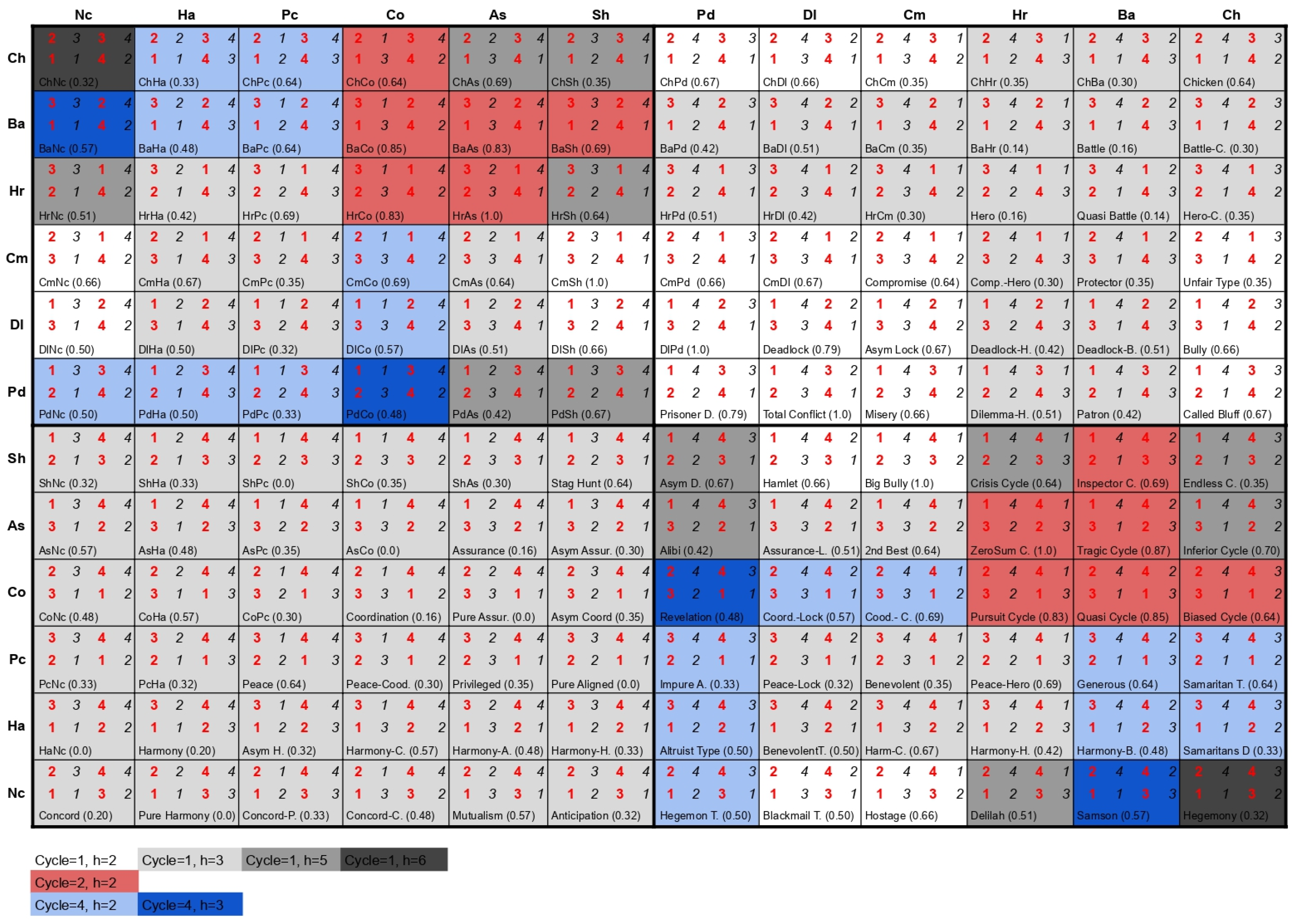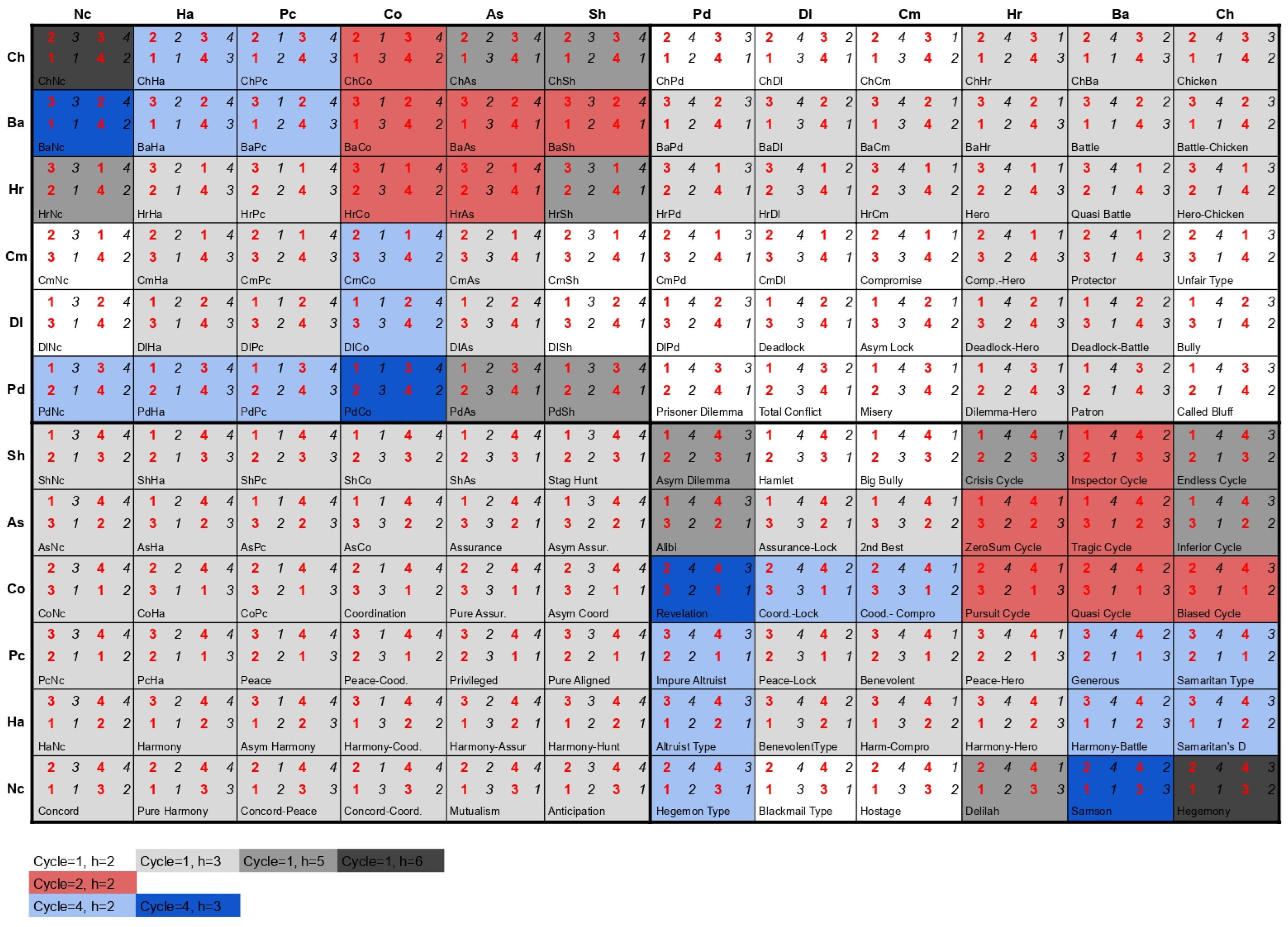 Thus, in principle, there are 144 strictly ordinal games. However, if both DMs switch roles, the conflict does not change, generating a symmetry. In fact, there are 12 symmetric games in which both DMs have the same pattern of behavior (such as the Prisoners’ Dilemma, Chicken game, Stag-Hunt, etc). For each of the remaining 132 games, where DMs have different behavioral patterns, there is a symmetric one where the behavioral patterns of the DMs are reversed. For example, one DM playing the Chicken game and the other playing the Prisoners’ Dilemma (ChPd) is the same game (PdCh), where the roles of the DMs are reversed. Thus, they share the same result in any strategic analysis, and consequently, there is no need for duplication, only repetition of the results found. By dividing the 132 distinct games by two, we obtain 66, which added to the other 12 symmetric games’ result in the 78 distinct games that were analyzed according to the cycle.
