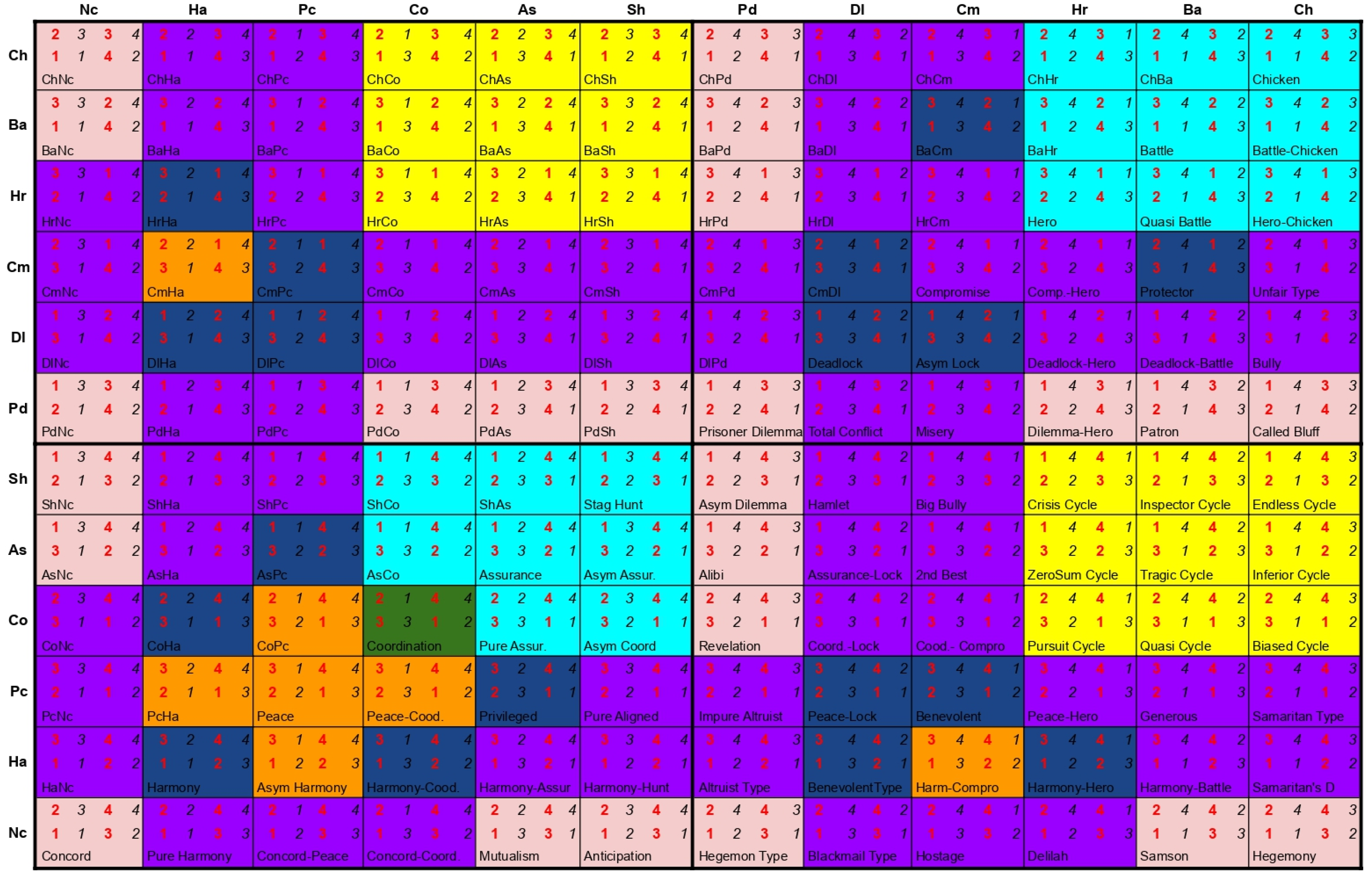 permutations of the numbers 1 through 4, which we divide by two so as to identify those that are distinct only due to the names of the DMs’ strategies. For example, describing the Prisoners’ Dilemma with “Defection” on the top line and “Cooperation” on the bottom (reversing those strategies) does not change the game in any essential way. These 12 patterns are named according to the names of the symmetric games that they generate: No Conflict/Concord (Nc), Harmony (Ha), Peace (Pc), Coordination (Co), Assurance (As), Stag-Hunt (Sh), Prisoners’ Dilemma (Pd), Deadlock/Anti-Prisoners’ Dilemma (Dl), Compromise/Anti-Chicken (Cm), Hero (Hr), Battle of the Sexes (Ba), and Chicken (Ch).