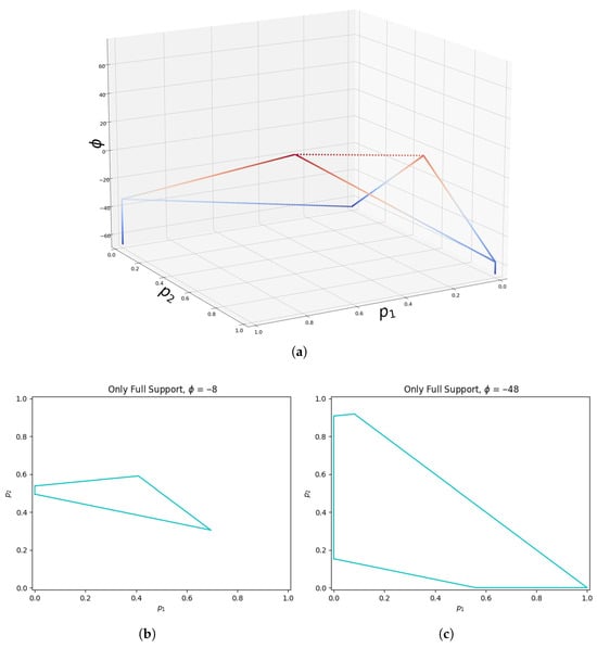 Visualization of the full support safe space for a game (panel (a)). Each horizontal slice of the shape is the polyhedron corresponding to the safe space given by the threshold , where a colder color represents a lower threshold. Panels (b) and (c) are examples of horizontal slices at thresholds and , respectively. Vertices of the polyhedra vary linearly and converge to maximin strategies (typically unique, but not unique in general) at the maximin value.