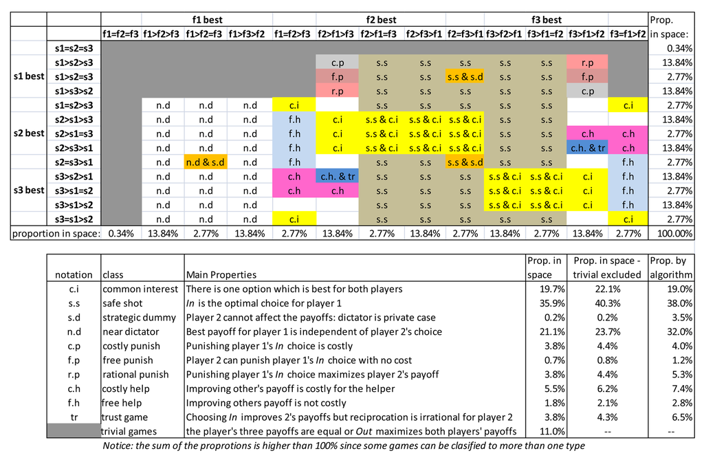 The current study focuses on games that were sampled from Figure 2′s space using the quasi random sampling algorithm described in Appendix 1. The algorithm excludes the sampling from the trivial class (games in which action Out yields the best payoff for both players or in which all payoffs are equal for a player—the dark gray cells) and implies slight oversampling of interesting games. The implied sampling proportions by this algorithm are presented on the rightmost column in the lower panel of Figure 2.