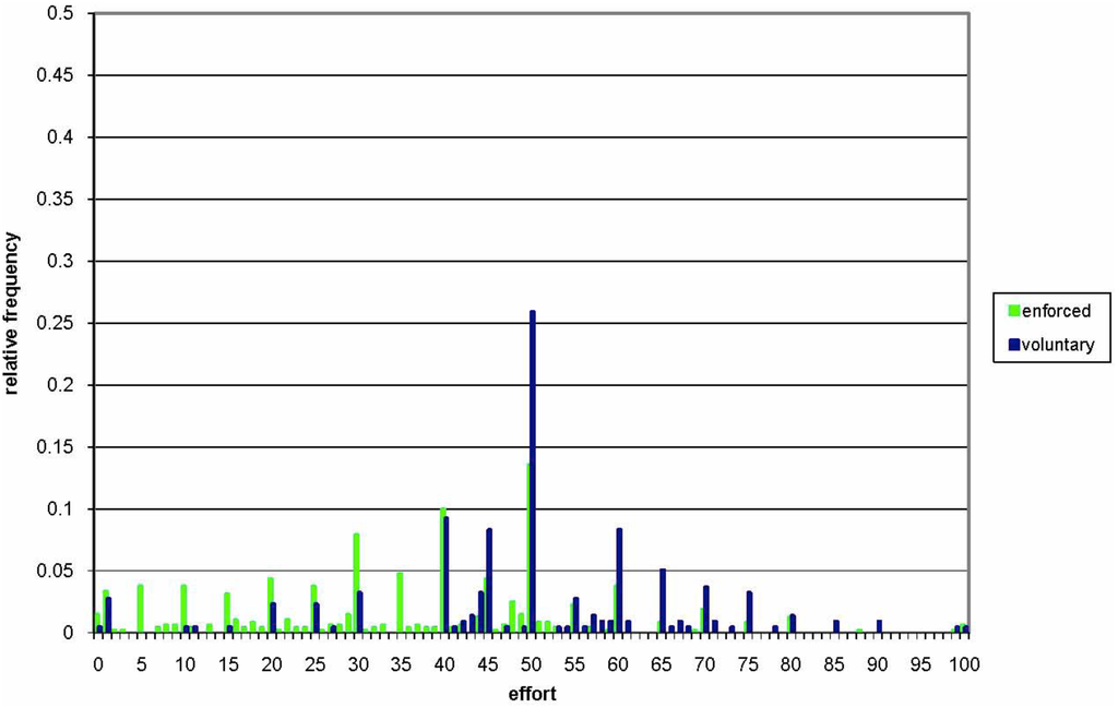 Figure 1 compares the density of effort under voluntary and enforced teaming. While we rarely observe enforced effort above the joint profit-maximizing level of 50 (15 percent of all observations above 50, 72 percent below), voluntary effort seems to be allocated at and around 50 (37 percent of all observations above, 38 below). Effort levels above 50 might be used as a signal for one's willingness to cooperate with the other, in particular if one expects the other to make an effort below 50 in the current period. The payoff function is relatively flat around the optimum so that the cost of going slightly above it is not very high. But, effort levels above 50 could also simply be due to random decision making and/or misunderstanding of the payoff function. The latter is unlikely to account for the majority of the observations above 50 in the voluntary teaming treatment as we observe only relatively few effort choices above 50 in the enforced teaming treatment. It could be seen as an unfortunate drawback of our experimental design that the middle of the strategy space coincides with the joint profit-maximizing effort, as in some cases participants might have just gone toward the middle of the strategy space. However, as will be seen below, this middle point was not chosen very often in the asymmetric cases, except by the low-cost players in the ENFORCED ASYM treatment. Note that when the Pareto optimum lies at the border of the strategy space so that participants have no opportunity to go above, either intentionally or erroneously, this might cause the observed cooperation level to lie much further below the Pareto optimum than it otherwise would.