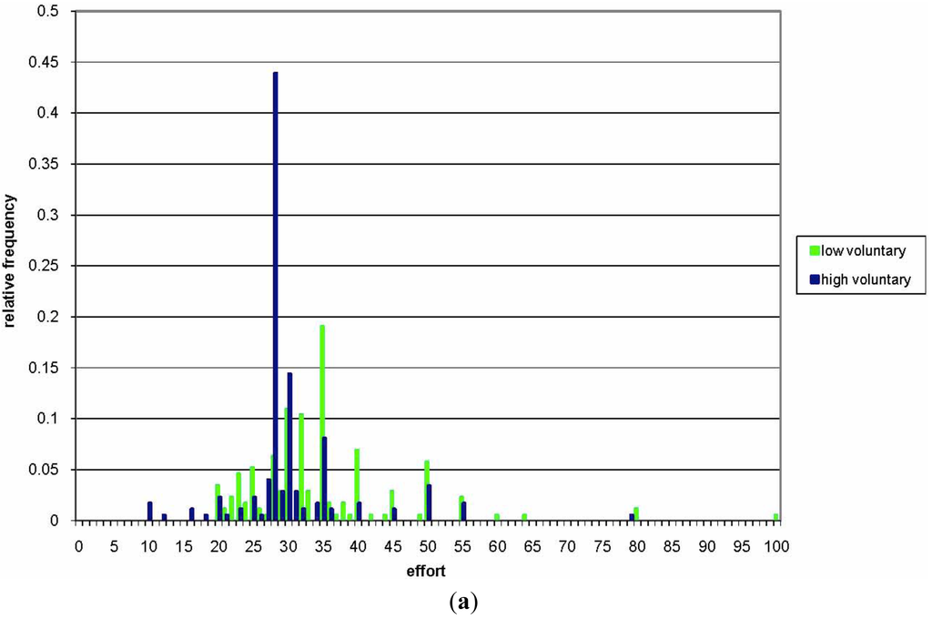 In the experiments, participants played 30 repetitions, called periods, of the effort game in two-player groups that remained unchanged during the entire experiment (“partners” design). Based again on the backward induction principle, the subgame perfect equilibrium prediction of the finitely repeated effort game prescribes in each period the subgame perfect equilibrium prediction presented above. Behaviorally, however, the repetition opens up room for reciprocal behavior or conditional cooperation.