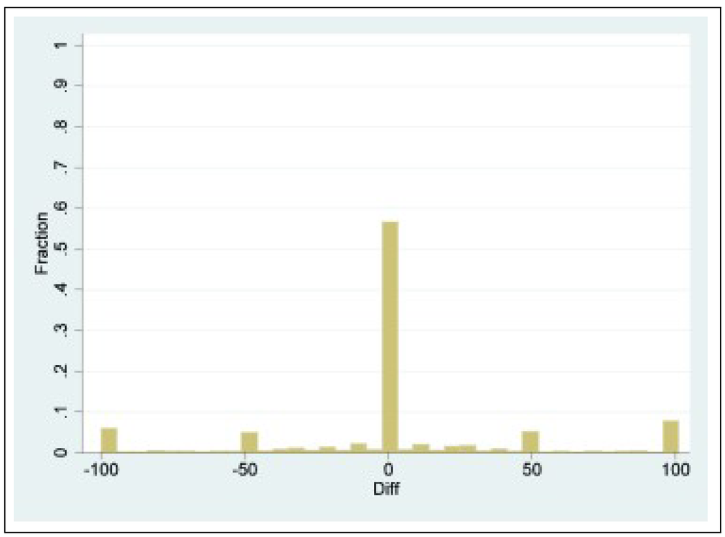 Figure 1 shows the distribution of the changes of X-balls in successive rounds. Five peaks are worth noticing. The by far highest peak at 0 reveals that in more than 50 percent of the cases there is no change toward the next round. Of these only 5 percent are sticking to pure strategies, whereas all others repeat the former completely mixed strategies. The other peaks, at –100 and 100, reveal that switches between the pure strategies occur in slightly more than 10 percent of the cases. The peaks at –50 and 50 reveal switches from the symmetric equilibrium to one of the pure strategies or vice versa. Those switches occur in less than 10 percent of the cases.