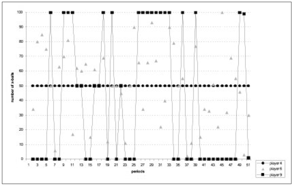Finally, Figure 2 illustrates the temporal paths of X-balls choices for three different participants in the first matching group. Participant 4 chose 50 X-balls in every round, whereas participant 9 quite regularly alternated her choice of X-balls between 100 and 0. Participant 6 is an example of a player who avoided the extrema. This illustration suggests the existence of heterogeneous decision rules, which is confirmed in our individual-data analysis below. Distinguishing participants with constant or alternative play, such as participant 4, respectively 9, can be easily accomplished by a median split via computing the average change in the number of X-balls from one round to the next. Doing so neither reveals nor clears out differences in choice probabilities, payoffs, or information retrieval.
