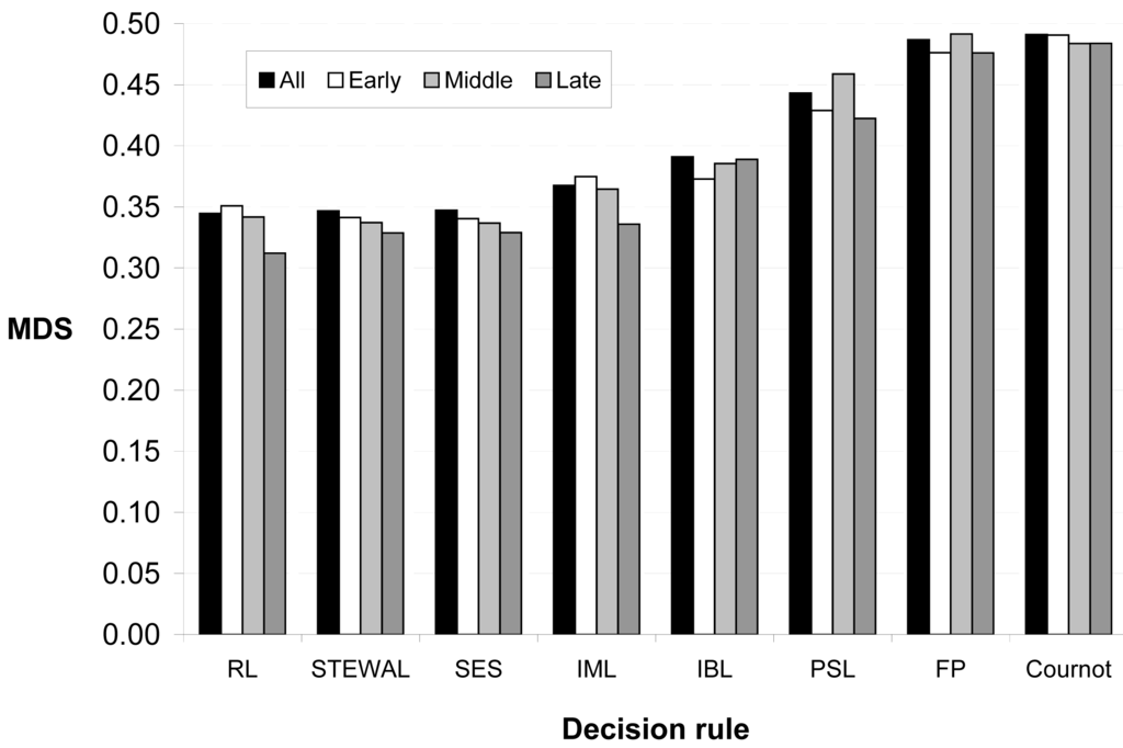 Figure 3 reports the mean deviations scores averaged over all 108 subjects. For most learning models as well as for the symmetric equilibrium strategy, minor differences are observed between the predictive power of early, middle, and late play. Still, in the case of reinforcement learning, self-tuning experience-weighted attraction learning, impulse-matching learning, and the symmetric equilibrium strategy, the predictive power clearly increases during the course of the session. We performed pairwise comparisons of these scores with the help of Fisher–Pitman permutation tests for paired samples. As summarized in Table 3, these statistical comparisons confirm the existence of heterogeneous decision rules among our participants. The three best learning models are self-tuning experience-weighted attraction learning, impulse-matching learning, and reinforcement learning, and their predictive power is comparable to that (the one) achieved by the symmetric equilibrium strategy. Note that the mean deviation score of self-tuning experience-weighted attraction learning is minimized when the response sensitivity equals 0.32, whereas the mean deviation score of payoff-sampling learning is minimized when the sample size equals 2.
