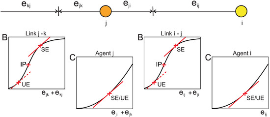 (Reprinted from [21]) Adjustment of investments. Shown are the perceived cost functions C and benefit functions B (insets) for the example of an agent i of degree one interacting with an agent j of degree two (sketched). The function B depends on the sum of the agents investments into the interaction while C depends on the sum of all investments of the agent. In every equilibrium (SE or UE) stationarity demands that the slope of these functions be identical. This requires that the agents make identical total investments. In stable equilibria (SE), the operating point lies in general above the inflection point (IP) of B, whereas equilibria found below the IP are in general unstable (UE). Therefore, in a stable equilibrium both links produce the same benefit and both agents make the same total investment. Iterating this argument along a sequence of bidirectional links yields the coordination properties (i) and (ii).