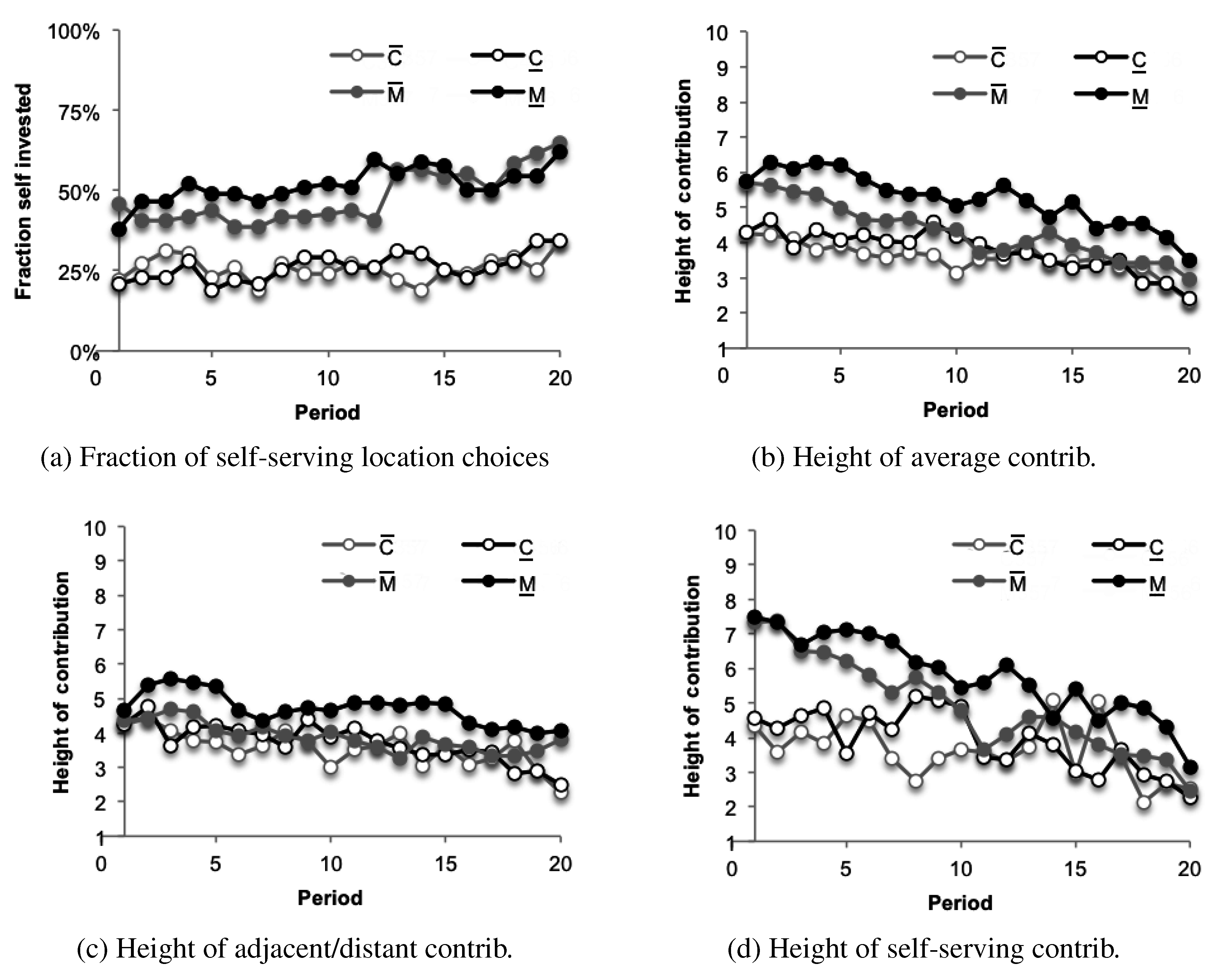 4]. Participants who cooperate conditionally adjust their contributions toward the average contribution of the whole group. This “reciprocal” adjustment is not perfect, but typically favors the adjusting participant, leading to a decline in contributions over time [