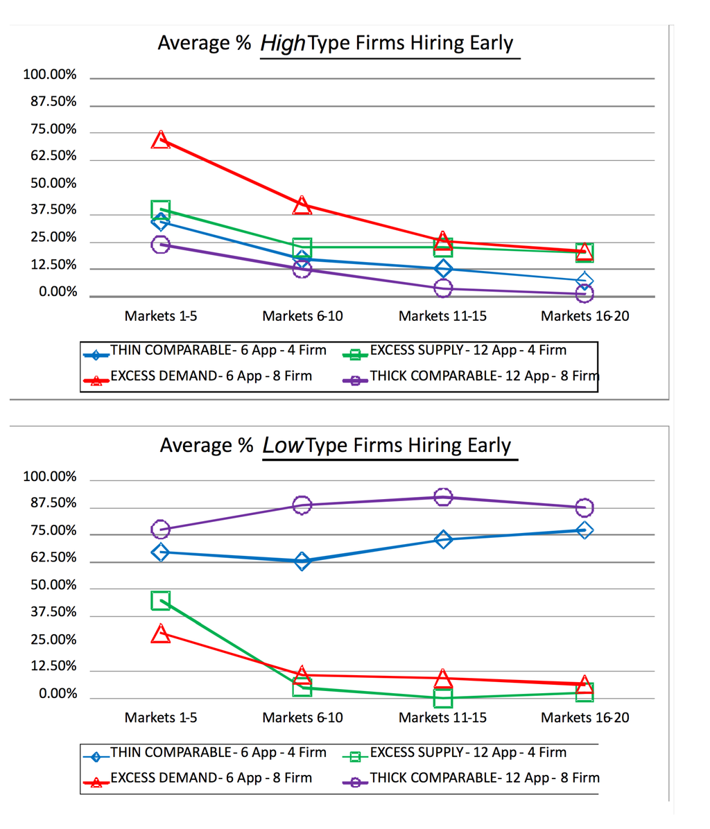 Similarly, the excess supply treatment also approaches SPE predictions of late hiring by both high and low quality firms (see Figure 1 and Table 3).