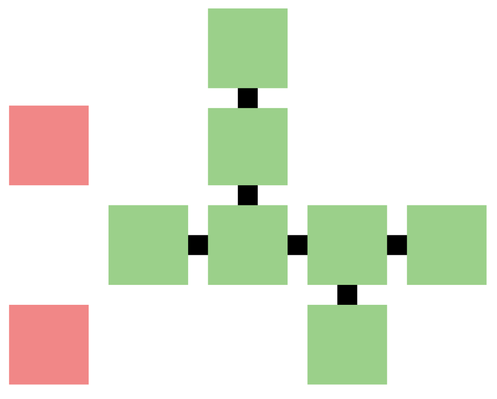 A cluster of at least three agents connected through their von-Neumann-neighborhoods may decide whether to build an institution. This cluster is formed by all agents directly or indirectly connected to each other, who currently are not members of an existing institution, i.e., there is a path (unbroken chain) that traverses only members of the cluster, each of who is a von-Neumann neighbor of the former. An example for such a small cluster can be seen in Figure 1, which shows properly positioned neighbors (i.e., members of the cluster) in green and unreachable neighbors in red.