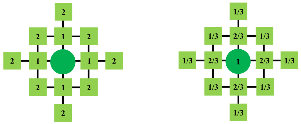 The parameter λ ϵ [0,1] is exogenously given and serves as a weight for the loss in quality of enforcement, i.e., a decrease of leadership effectivity with increasing distance (leadership distance decrement). Thus, a value of λ = 1/3 means that agents with a distance of at least three fields do not receive any payoff from formal games anymore, though, in the model at hand, it is only relevant at which distance the expected payoff of institutional cooperation drops below the expected payoff of informal games. Nevertheless, if only taking this decrease of effectivity into account, the above case would lead to a maximum von-Neumann distance of two fields from the leader, and a maximum institution size of 12 members and one leader. This can be seen on left hand side of Figure 2, which shows the von-Neumann distances from the leader in the center. It follows that smaller values of λ enable the emergence of much larger institutions. However, it is highly unlikely that institution size will ever come near to the theoretical maximum for that λ value as indicated before since the expected formal payoff is very low further away from the leader. Thus, the value of λ is more relevant for the question how much of the reward payoff remains on the cells near the leader, e.g., with a high value of λ even agents directly adjacent to the leader would gain very little or even too little payoff from formal games. The remaining share of the reward payoff, with respect to the distance from the leader (1 − λδi,L)—again for the example of λ = 1/3—can be seen on the right hand side of Figure 2 (2R/3 if 1 field away, R/3 if two fields away, 0 if three fields away, with 0 not being displayed).