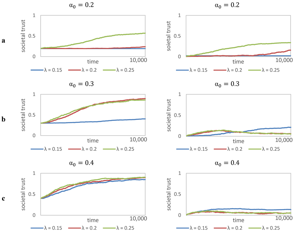 Taking a closer look lets us follow that a lower λ leads in general to lower levels of societal trust within the simulation experiments. In Figure 3a,b the lowest level of societal trust is given in the cases of λ = 0.15, wherelse λ = 0.25 leads to the highest levels of societal trust in all permutations. Of course this relation corresponds with the basic model setup as indicated in Section 3.2: lower λ results in larger institutions (smaller loss of power dependent on the distance between member and leader). Due to the spatial interaction topology (i.e., locality effects), it is more likely that agents become members thereafter. In the very long run, high α0 leads to processes where societal trust tends to converge to full cooperation.