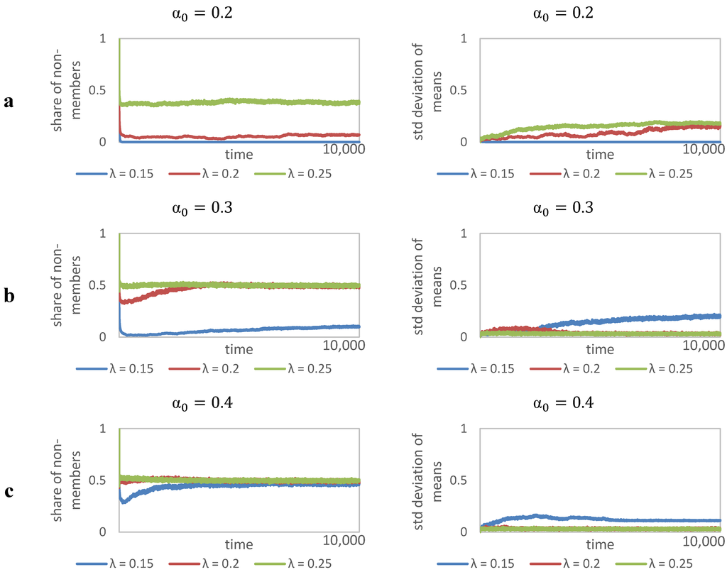 In summary institutions in our model indirectly support social learning. Those agents with a low α are more likely to join institutions and thus become sedentary—compare Figure 14, where it can be seen that the average α of non-member is consistently higher than that of members (in the timeframe in which institutions are needed). In case of larger institutions a number of these low α agents are even out of reach of non-members or members of other institutions, as the former are embedded deep within the institution’s realm. Thus, these agents on average play fewer or even no informal games at all, during their membership in the institution. Non-member agents with a higher α stay mobile and then have a higher chance to encounter other agents, which also have a higher α. Thus they learn to cooperate even more over time, eventually increasing overall trust over time. These agents then function as “emissaries” of cooperation, slowly increasing the trust of agents situated on the outskirts of institutions (“teaching” them to cooperate). Since these are further away from their leader, their expected formal payoff can be quite low—depending on the λ parameter, which leads to larger institutions, but lower formal payoff. Thus, they can be quite sensitive to changes in cooperative behavior shown by informal games with wandering non-member agents and start to leave institutions quickly.