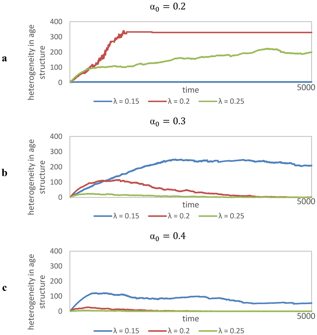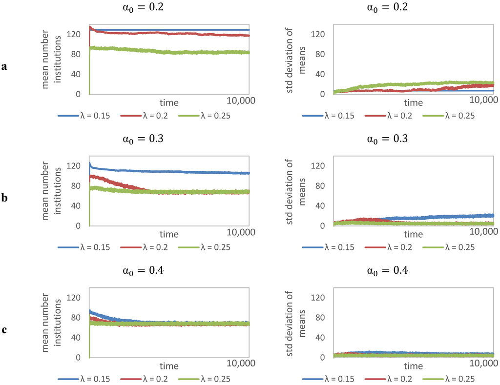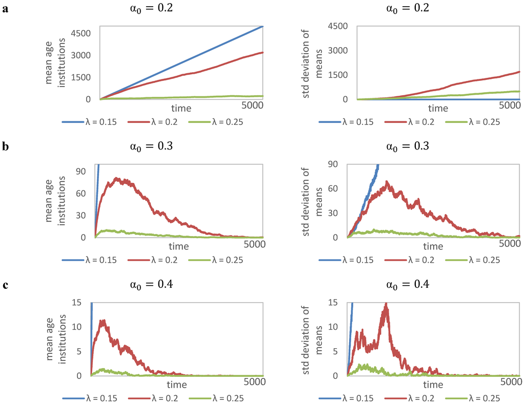 Furthermore, we have checked for the robustness of this result by looking into the average number of institutions respectively, as illustrated in Figure 5. Since the number of institutions further stabilizes after an adaptation phase of 2000–3000 periods (also visible in Figure 4) we can conclude that there is a direct relationship between leadership distance decrement (λ) and the amount of institutions indeed as expected. Figure 5a–c show that permutations with λ = 0.25 result into 80 institutions, although this number deviates between 0–30 dependent on α0. Otherwise lower λ is more sensitive to the initial level of societal trust (α0). This analysis further indicates that interesting cases of permutations are appearing around α0 = 0.3 and λ = 0.2. These cases have to get investigated in more detail by looking into the mean age of institutions.