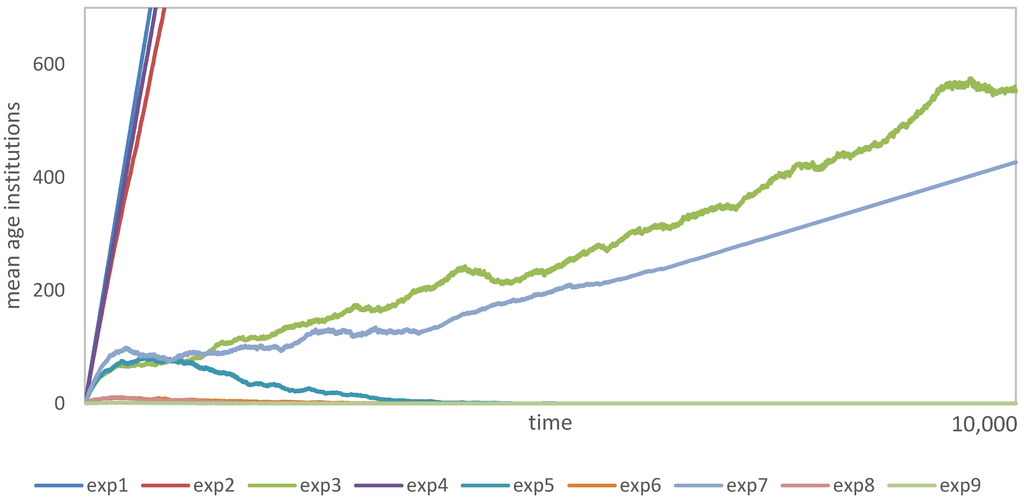 Since the population structure is rather stable, we have anticipated that the dynamics are more volatile in the evolution of institutions, dealing with entry, (in)stability and exit of institutions. Figure 6 shows the spectrum of institutional life cycles in a grand comparison of all computed permutations in simulation experiments 1–9. Accordingly, we have derived a deeper analysis on the mean age of institutions, in particular the accumulation process dependent on individual action and social structure. This full picture illustrates that our model produces two main results concerning the demography of institutions. On the one hand, institutions accumulate quickly from start due to a high number of free-riders in the initial population. Thereby, agents take refuge in governed institutional structures under leader supervision preventing exploitation in non-member state. Simulation experiments 1 and 2 result into this finite state of the simulation, where institutions do not fall apart anymore, i.e., their life-time is infinite. We call this result a static and ordered scenario of institutional change. On the other hand, simulation experiments 8 and 9 indicate that institutions cannot stabilize, because their leaders are not able to influence the periphery of their institutions effectively, thereby, the sum of collected membership fees remains too small for long maintenance of larger institutions, or ultimately any institution at all. In this case institutions have a very short life-time, they “pop up” very frequently in pulses. This final state of institutional change delivers the second main result in the “in silico” analysis of the model. We call this result a dynamic but highly fluctuating scenario of institutional change.