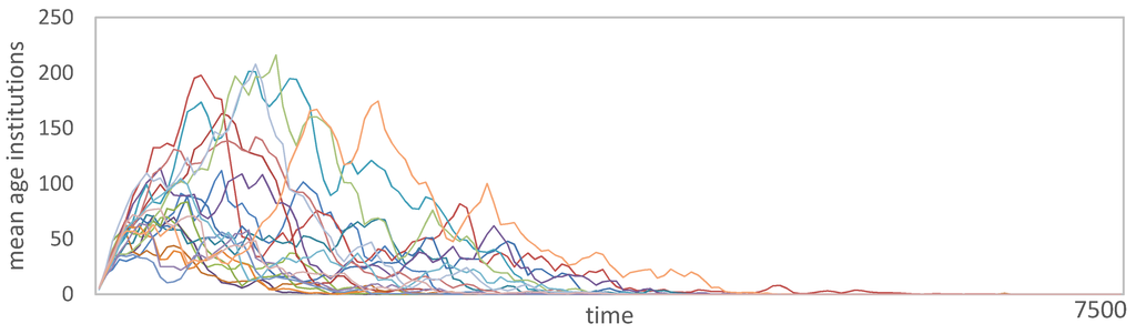 We observe that the higher the initial level of societal trust, the lower the heterogeneity within the age structure. Thus different values of λ may lead to phase-transitions towards another scenario. To conclude we want to turn the attention to the similarity in the trend of the aforementioned processes, which is not recognizable from the aggregated measures shown previously. Figure 9 gives the overall trend of replications within simulation experiment 5. It shows that institutions change indeed in cyclical processes, what we have dubbed institutional learning. The accumulation of these generic governed structures follows a similar trend, the cyclical behavior is of course leveled out in the aggregated views we have shown previously.