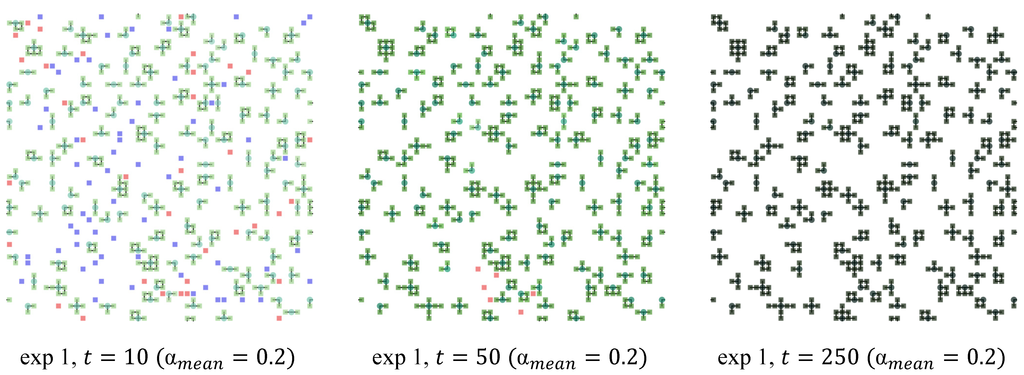 Figure 10, now, is an the visualization of the landscape of an exemplary run of experiment 1 (λ = 0.15, α0 = 0.2, other parameters as given in Table 1) and shows what we called a static and ordered scenario of institutional change. The first subpicture on the left hand side shows that after a very short time (at t = 10) most agents already are members of institutions, with a number of agents still wandering around. The next subpictures show that very quickly (at t = 50) most of the agents are now members of institutions, that most institutions are already relatively old and stable, with only very few agents still wandering around. Shortly after (at t = 250) all agents are members of institutions, which are completely stable (old). The society is now ordered, in the sense that there is only cooperation enforced in institutions and static since there are no elements of change anymore, i.e., the landscape is identical for all following time steps. Since this lock-in happened so fast, there was almost no change in the societal trust level—a graph of the development of societal trust over time would show a flat line.