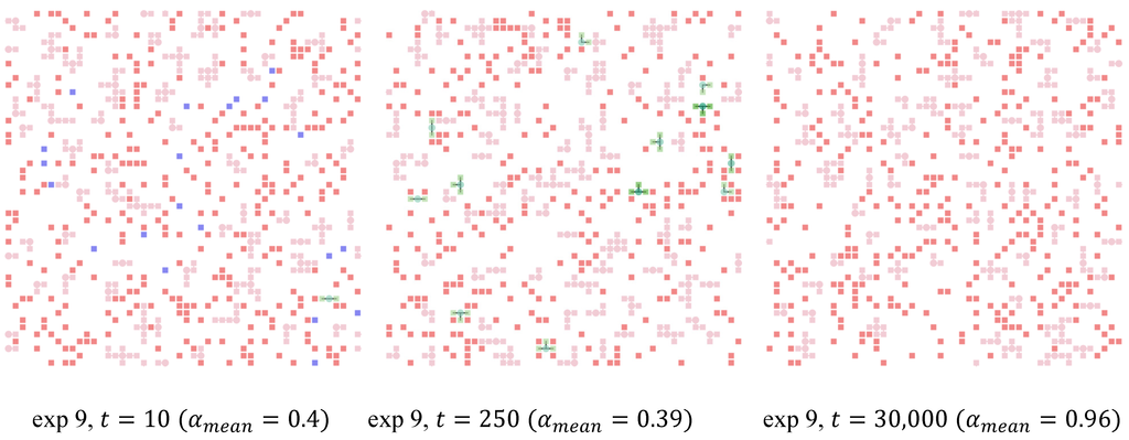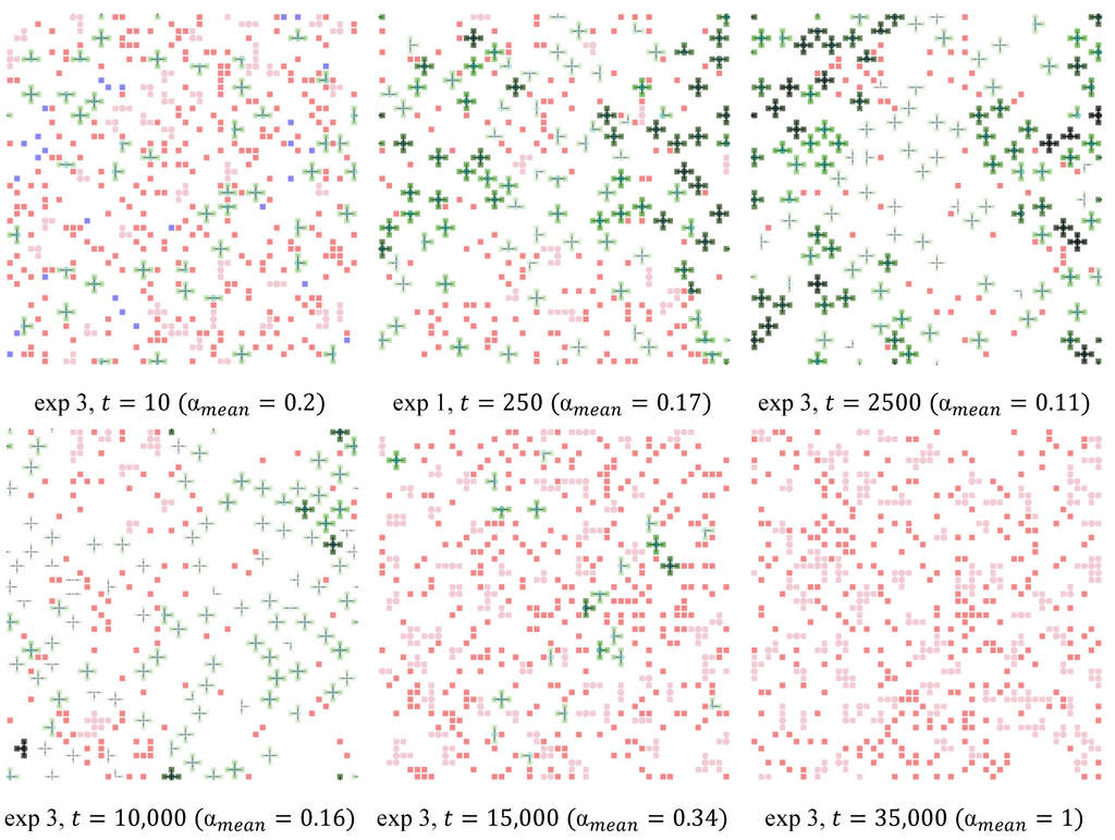 To give a more vivid and intuitive understanding of the different cases compare Figure 10, Figure 11, Figure 12 and Figure 13, which visualize the artificial landscape of exemplary runs of experiments 1, 3, and 9. The subfigures show snapshots of the landscape of agents and institution in different points of time—please note that there are different timespans between subfigures in Figure 10, Figure 11, Figure 12 and Figure 13, since the different classes have gravely varying convergence speeds. The subfigures show non-member agents, who have not yet been member of any institution depicted as blue squares and non-member agents who have already been in an institution before depicted as red squares. Furthermore, green circles depict leaders and green squares depict members of institutions, with black connections between members of the same institution. The darkness of institutional leaders and members indicates the age of the institution—i.e., light green reflects a young institution, where dark green depicts a relatively old institution. Figure 11 and Figure 13 additionally show pink (light red) squares and circles, which indicate agents in attempted institutions, i.e., institutions that only existed for one evaluation period (technically these have an institution age of 0). These come into existence when the overall level of α is very high and no stable institutions exist anymore and are disbanded immediately. When taking a look at the following figures, please keep in mind that we interpret the grid as a torus; it might look like there are one or two-person institutions at the edges of the landscape, but in truth they continue on the opposing edge of the landscape.