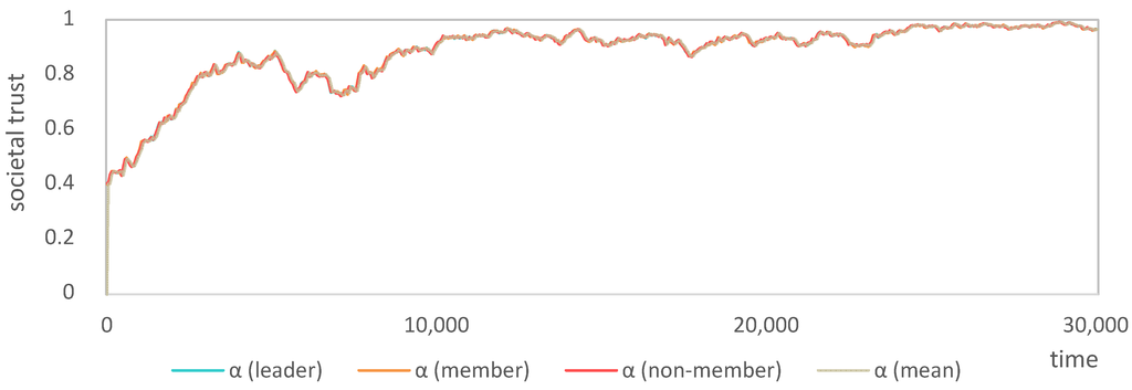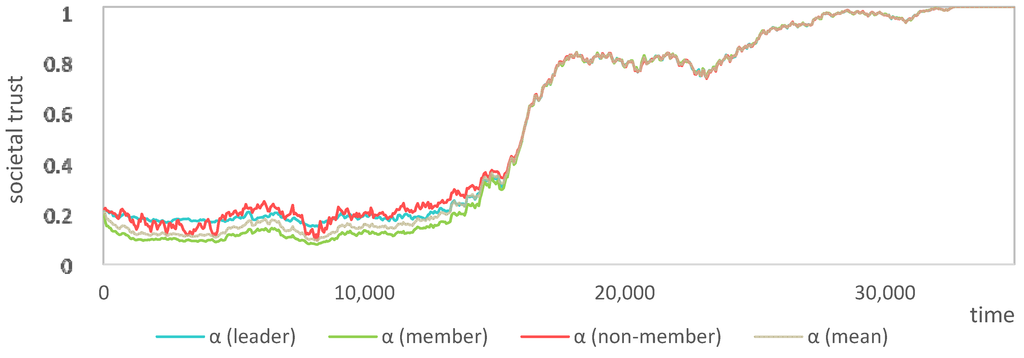 Figure 14 now shows the development of societal trust over time of the same exemplary simulation run, as depicted in Figure 13. As can clearly be seen initially α increases and decreases again, which is then followed by a kick-in of the self-reinforcing process. In the long run, societal trust rises until full cooperation is reached.