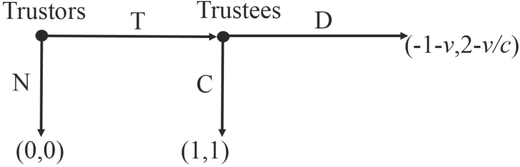 The basic Trust game can be thought of as a sequential, two-population version of the Prisoner’s Dilemma. Each Trustor (labelled 1 in what follows) can choose either to not to play (N), ensuring zero payoff for herself and her Trustee partner (labelled 2), or else chose to trust (T). In that case, the Trustee partner decides whether to cooperate (C) or defect (D), with respective payoffs (1, 1) or (–1, 2). Of course, the Trustees’ best response is D, implying that cooperation unravels in this basic game.