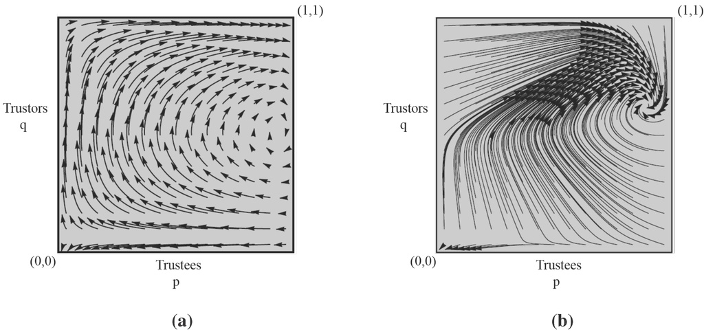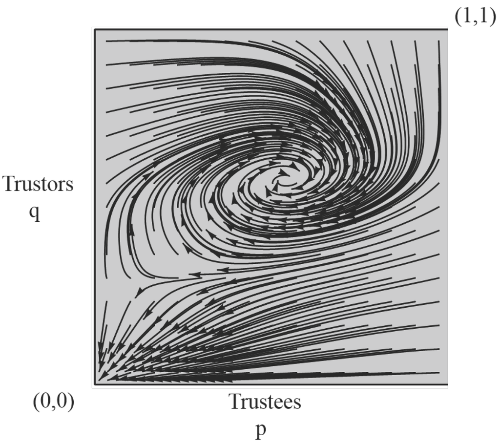 Besides the trivial NE , we also obtain an interior NE in this game at the intersection of the loci and , where and For example, let . Then the interior NE is with a high degree of trustworthy Trustees, and slight majority of moral code compliance.
