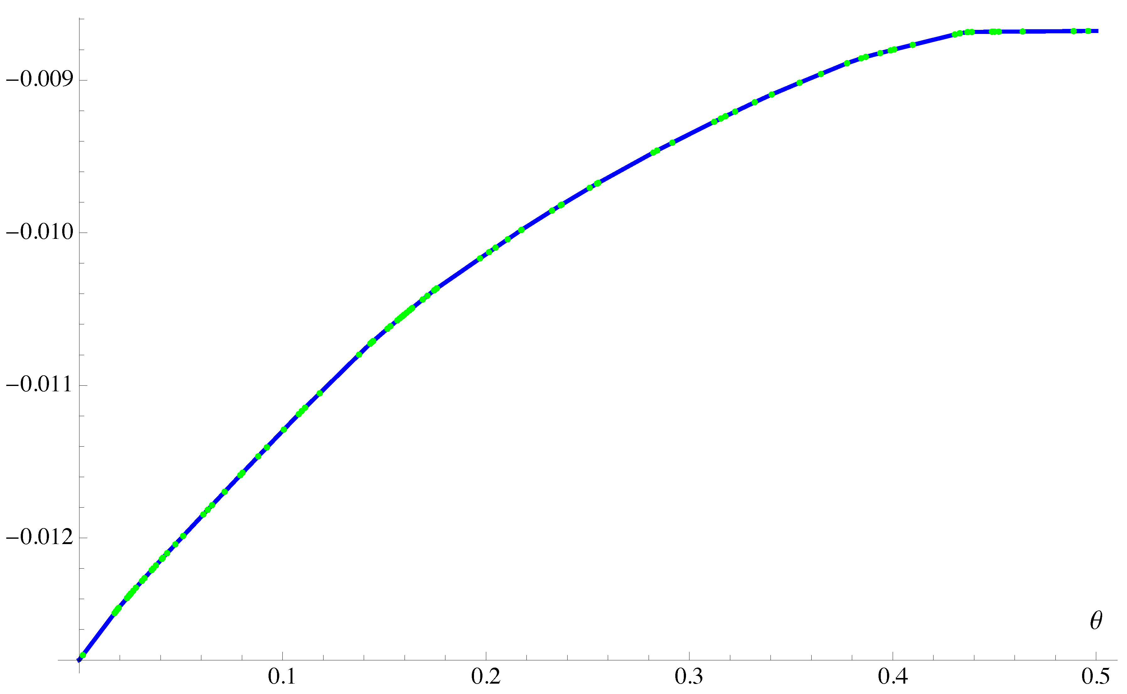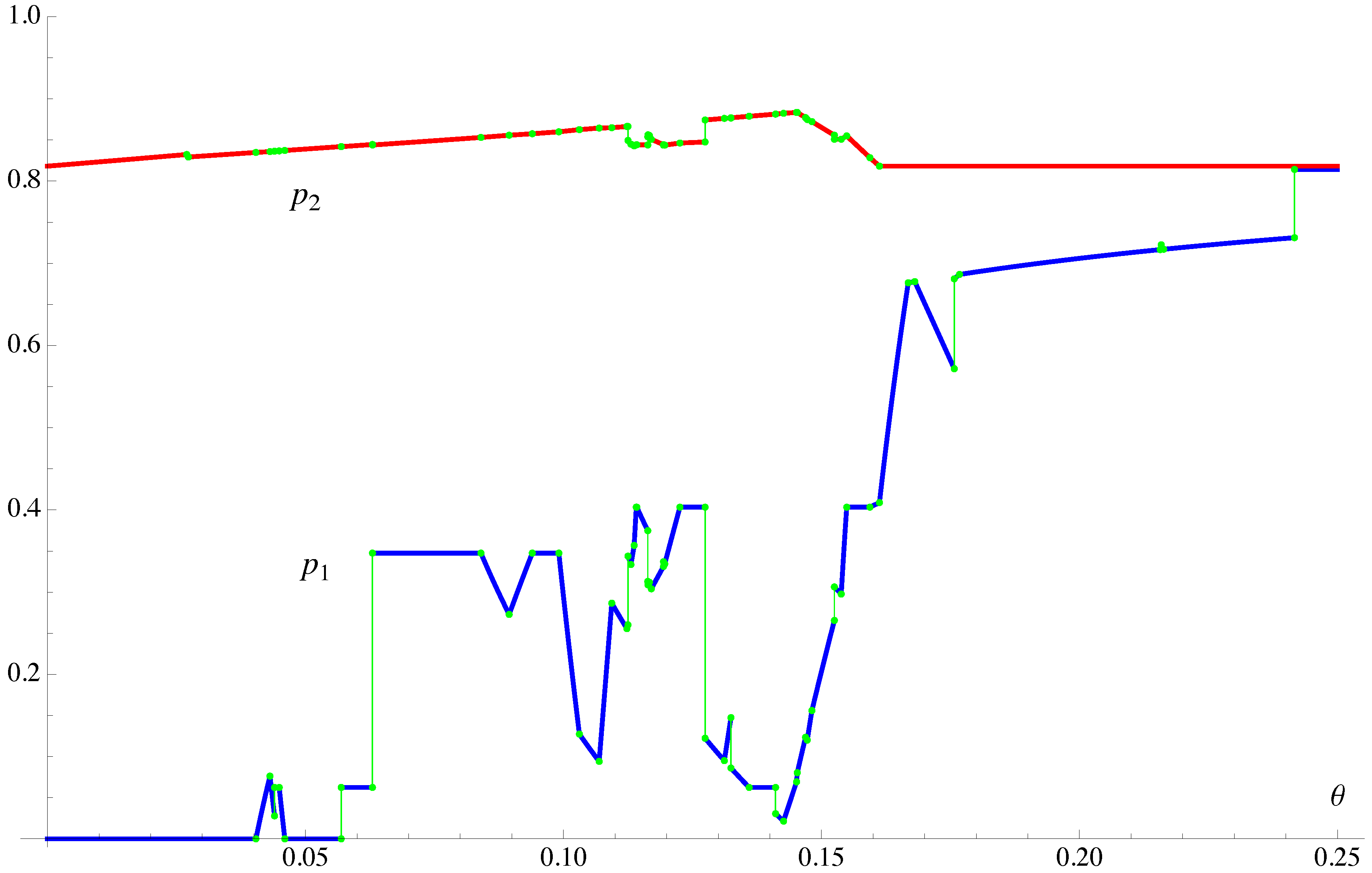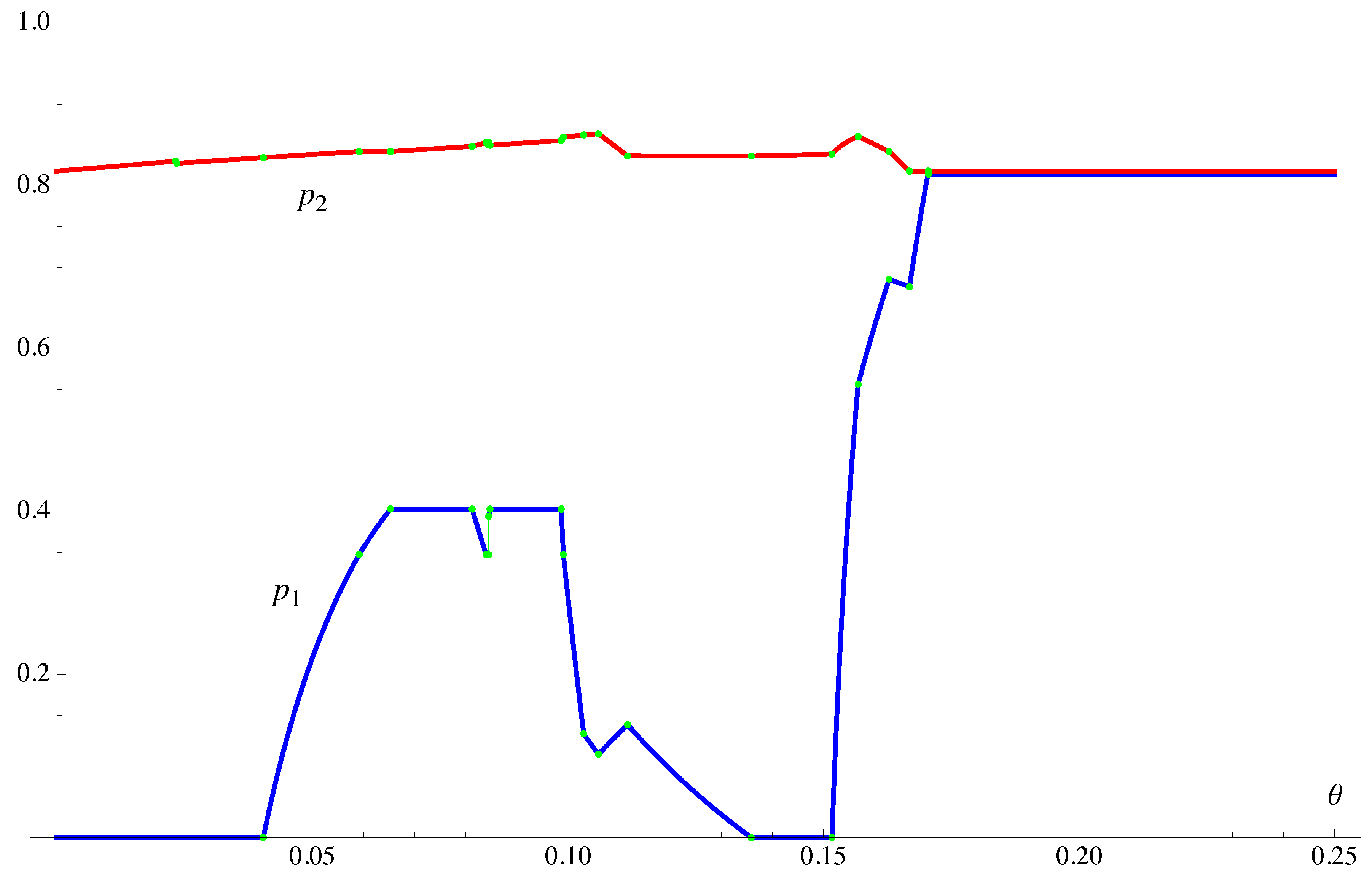 To mention a few of our findings, the two cooperative equilibria coincide when , and the Nash equilibrium is nearly the same. Elsewhere, with two exceptions, they differ. The correlated cooperative equilibrium is piecewise continuous in θ but with 109 discontinuities in . The Nash equilibrium is piecewise continuous in θ but with 102 discontinuities in . In both cases, the discontinuities come from Banker’s strategy. The Players’ strategies are continuous in θ in the Nash equilibrium except for one point of discontinuity. In the independent cooperative equilibrium, there are as many as 13 points of discontinuity in the Players’ strategies. The game’s lower value (to the Players) is continuous on and increasing on , approximately, and it is maximized at about . The maximum value is about . The game’s upper value (to the Players) is continuous on andincreasing on , approximately, and it is maximized at about . The maximum value is about .