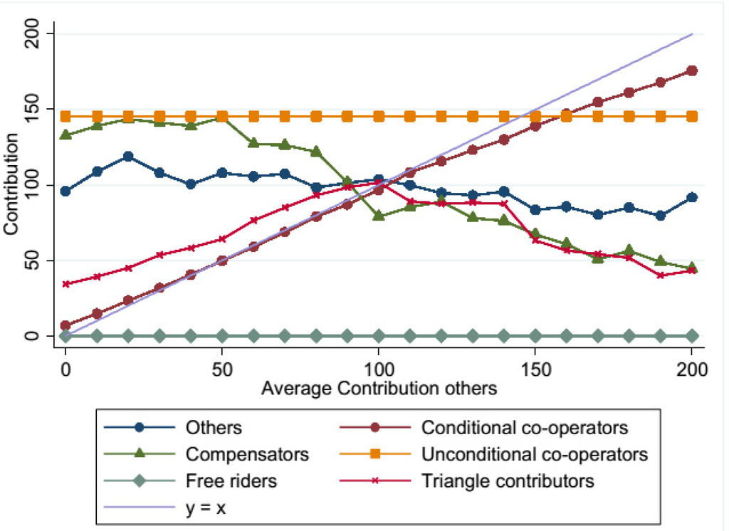 Using the Strategy Method, subjects are classified in six categories depending on their conditional contributions in the Public Good Game. Similar to [30] we classify as Conditional Cooperators those subjects that display a significant monotonically increasing pattern between their conditional contribution and the average contribution of the other group members (Spearman rank correlation ρ > 0, p < 0.01); as Free Riders those who always contribute zero, and as Triangle contributors those who display a significant monotonically increasing pattern up to a maximum (Spearman ρ > 0, p < 0.01) and a significant monotonically decreasing pattern after that maximum (Spearman ρ < 0, p < 0.01). We also add two categories. Subjects who contribute a positive amount irrespective of the others’ contributions are classified as Unconditional Cooperators, whereas subjects who display a significant monotonically decreasing pattern (Spearman ρ < 0, p < 0.01) are classified as Compensators, as they seem to counterbalance low contributions by the others. All remaining subjects are pooled in a residual category called Others. In Figure 1, we report the average contribution of each type of subject, conditional on the average contribution of the other group members.