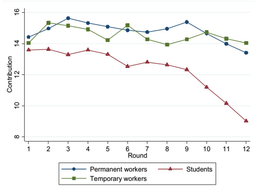 - 8The additional tasks consist of 24 additional rounds of the Public Good Game with some design changes with respect to the initial 12 rounds, and a Stag Hunt Game with framed instructions. Since the subjects were not informed about the content of the future tasks, no distortion in their choices was artificially introduced by the experimenters. To very briefly summarize the findings of these additional tasks, the contributions of permanent and temporary workers remain high all over the 24 additional rounds, whereas the contributions of students drop dramatically after restarting the Public Good Game. This pattern is consistent with the first 12 rounds of the Public Good Game reported in the main text. In the Stag Hunt Game, permanent and temporary workers display very similar behaviors, while students are less likely to cooperate compared to both permanent and temporary workers. More details about these additional tasks are available from the authors upon request.
