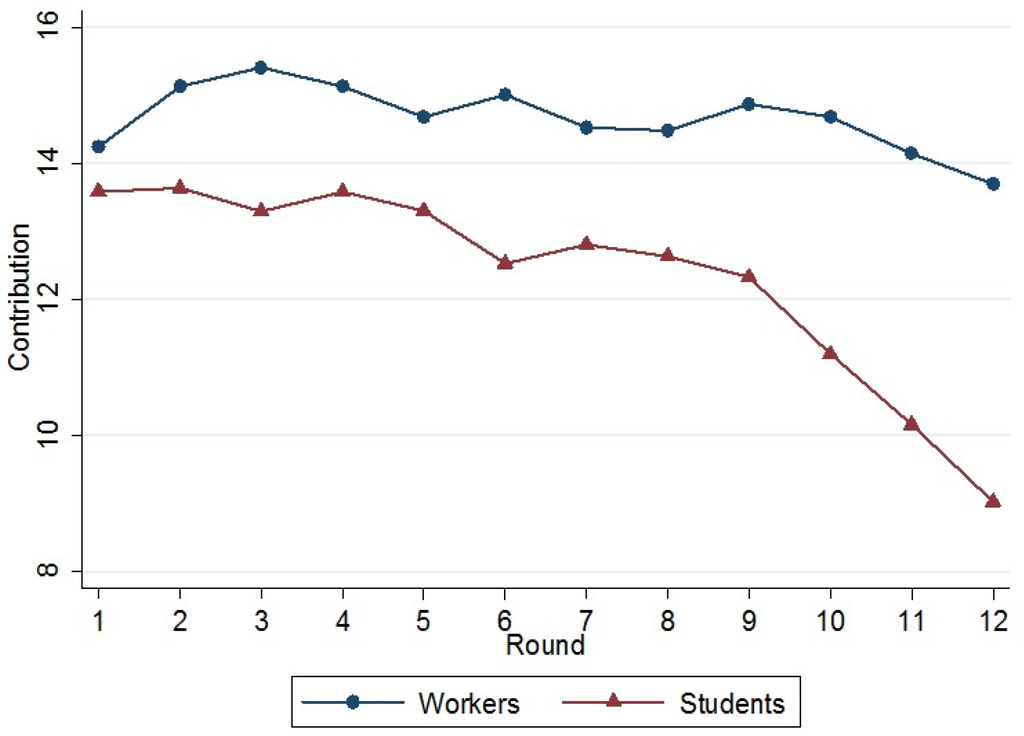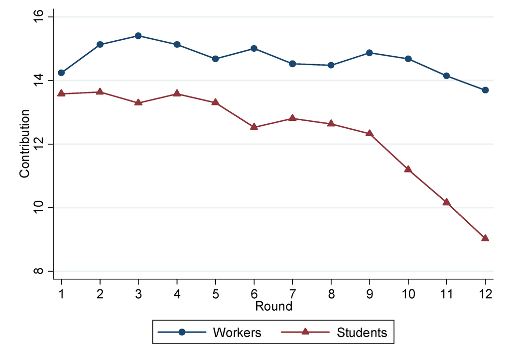 Undergraduate university students can be easily recruited for experiments and are the typical object of inquiry in the experimental social sciences. One critical issue linked to this admittedly specific population concerns whether the experimental results obtained with students are robust to using other populations, such as workers or older age people [1,2,3,4]. To address this issue, the literature has compared the behavior of undergraduate students with different types of workers, such as nurses [5], Chief Executive Officers [6], workers in a publishing distribution warehouse [7], bicycle messengers [8], and clerical workers [9].