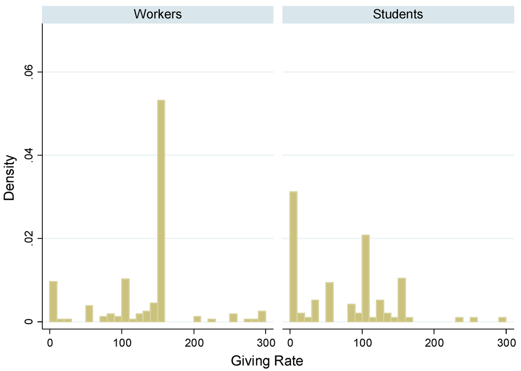 We can reject the hypothesis that being beneficent is independent of whether a subject is a temporary worker, a permanent worker or a student (Chi-squared test, p < 0.001). 11 The proportion of beneficent subjects among temporary and permanent workers is significantly larger than among students (Chi-squared test, p < 0.001). In comparison with the literature, note that the share of beneficent subjects among our undergraduate students is lower than the one found in [17], where the majority of subjects (61%, i.e., 43 out of 71) was classified as beneficent. However, the average offer by students is in line with the literature (see, e.g., [35]). Although beneficent subjects are more common among the permanent workers than among the temporary workers, the difference is only weakly significant (Chi-squared test, p = 0.091) and disappears once we control for other covariates (see next paragraph on the regression analysis). 12 This allows stating the following: