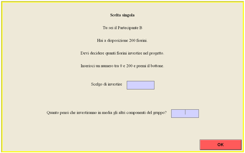 - 7As shown in [34], in a Public Good Game, on-screen instructions requiring forced inputs improve on subjects’ comprehension and familiarity with the experimental task. They also contribute to reduce both decision and waiting times without affecting the overall pattern of contributions.