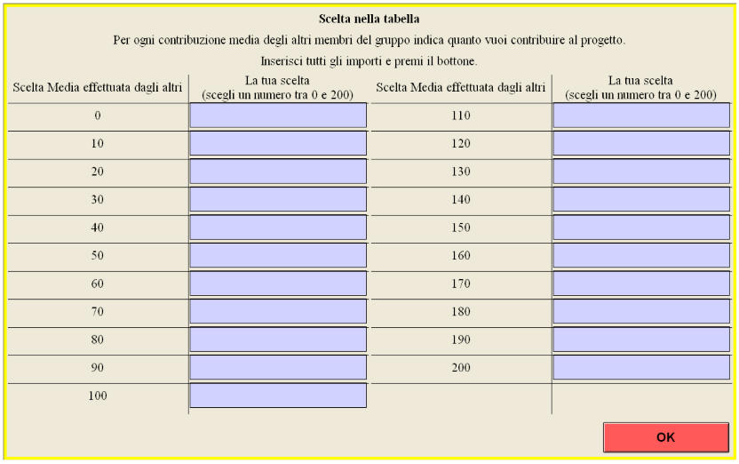 where is player i’s contribution to the public account and the contribution by the other members of the group. Since the contributions of the group to the public account are doubled and equally divided among the group participants, the marginal individual benefit from contributing to the public good is 0.5. Subjects are first asked to make an unconditional contribution to the public good, and then to indicate their willingness to contribute to the public account, conditional upon different possible contributions of the other group members. The possible average contributions range from 0–200, and are listed as multiples of 10 tokens. After the choices are made, one subject per each group is randomly selected and paid according to her conditional contribution to the unconditional contributions of the other three members. The remaining players are paid according to their unconditional contributions. This task provides a measure of subjects’ cooperativeness.