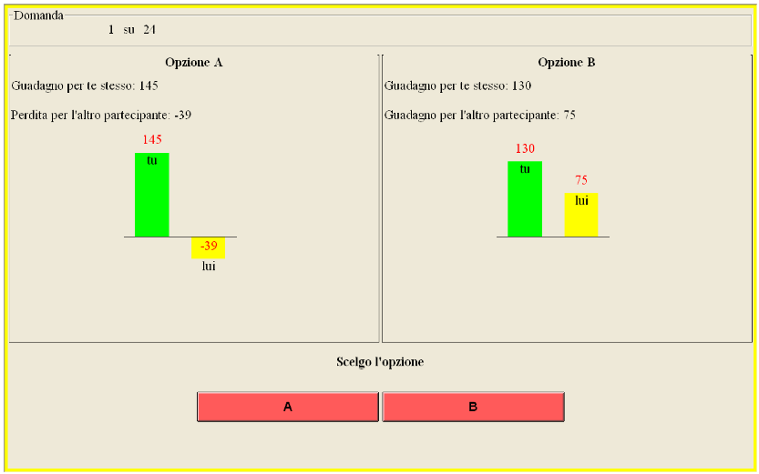 In the third classification task, we employ a Decomposed Game Technique, a classificatory task used both in the economic and psychological literature to study the distributional preferences of subjects (e.g., [17,18,31,32,33]). Participants are asked to choose between two possible allocations of money. For example, a subject must choose whether she prefers an allocation where she receives 130 tokens and the other participant receives 75 tokens, or an allocation where she receives 145 tokens and the other participants loses 39 tokens. Subjects are randomly and anonymously matched in couples and asked to make 24 choices between pairs of allocations. The individual earnings are equal to the sum of the payoffs of the 24 choices made by the subject and by her co-participant, who remains the same throughout the 24 choices (for more details, see [17,18,31]).