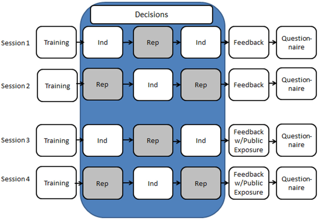 Outline of the experimental design. Decisions as Individuals (Ind) and Decisions as Group Representatives (Rep).