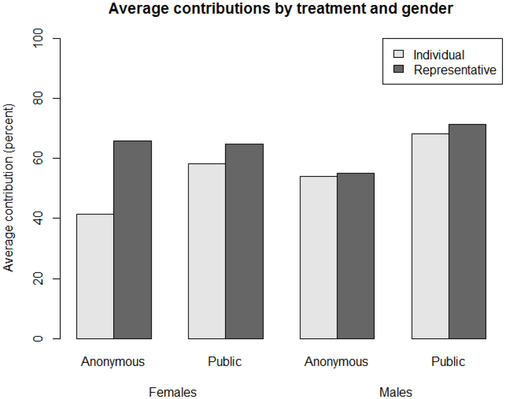 Two factors that seem to matter for decisions made by group representatives, is gender and whether decisions are anonymous or made in public. As mentioned above, men and women have been found to respond differently to behaving as representatives, compared to as individuals, in dictator games. Song, Cadsby and Morris [4] compare dictator behavior in an inter-individual dictator game and an inter-group dictator game. They found that women gave away slightly, but not significantly, more in the role as representatives compared to as individuals, while men give away significantly less as representatives. Men and women may also respond differently to having their decisions being observed by in-group and out-group members: women have been found to cooperate more when observed by their in-group, while men cooperated less [26].
