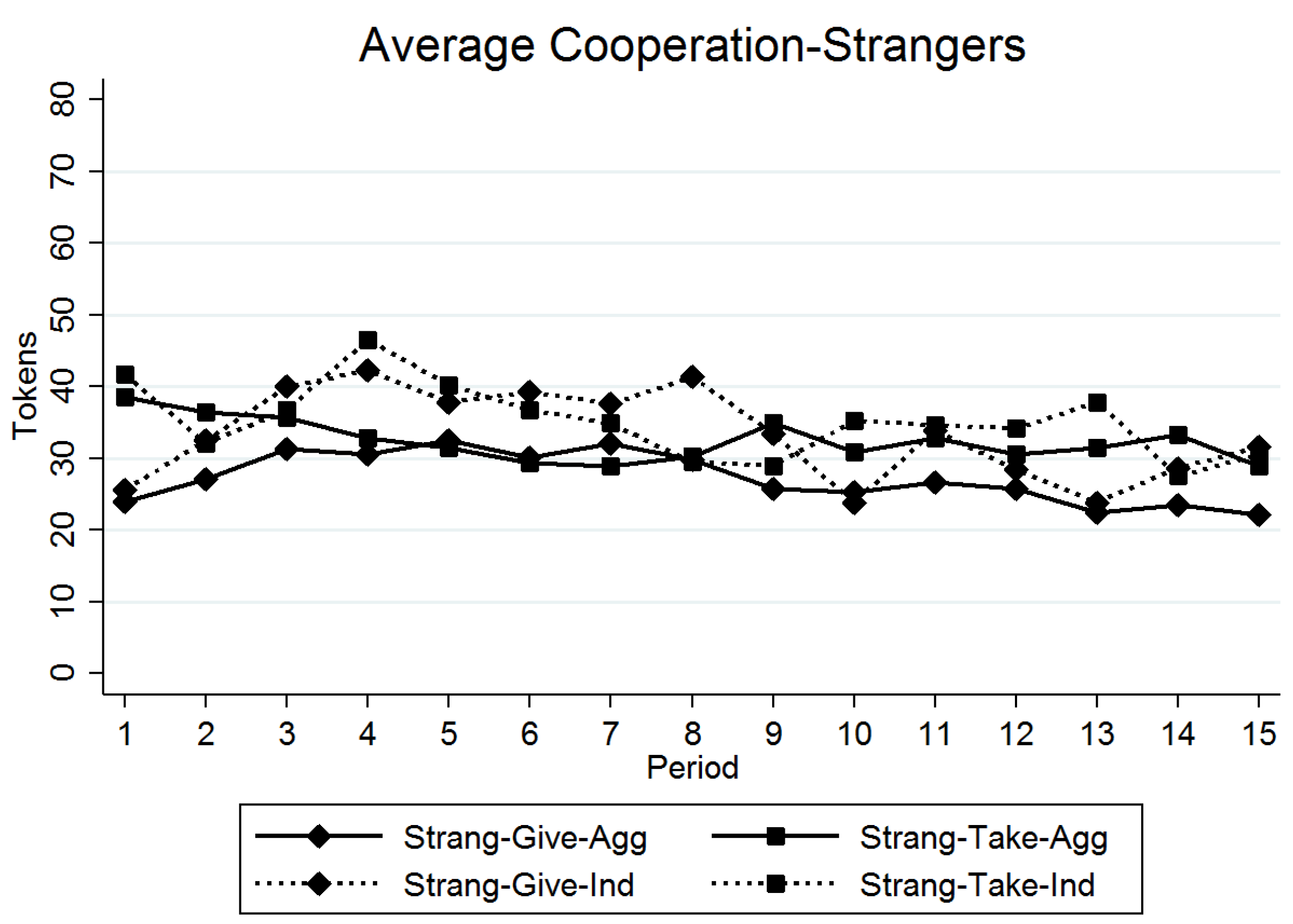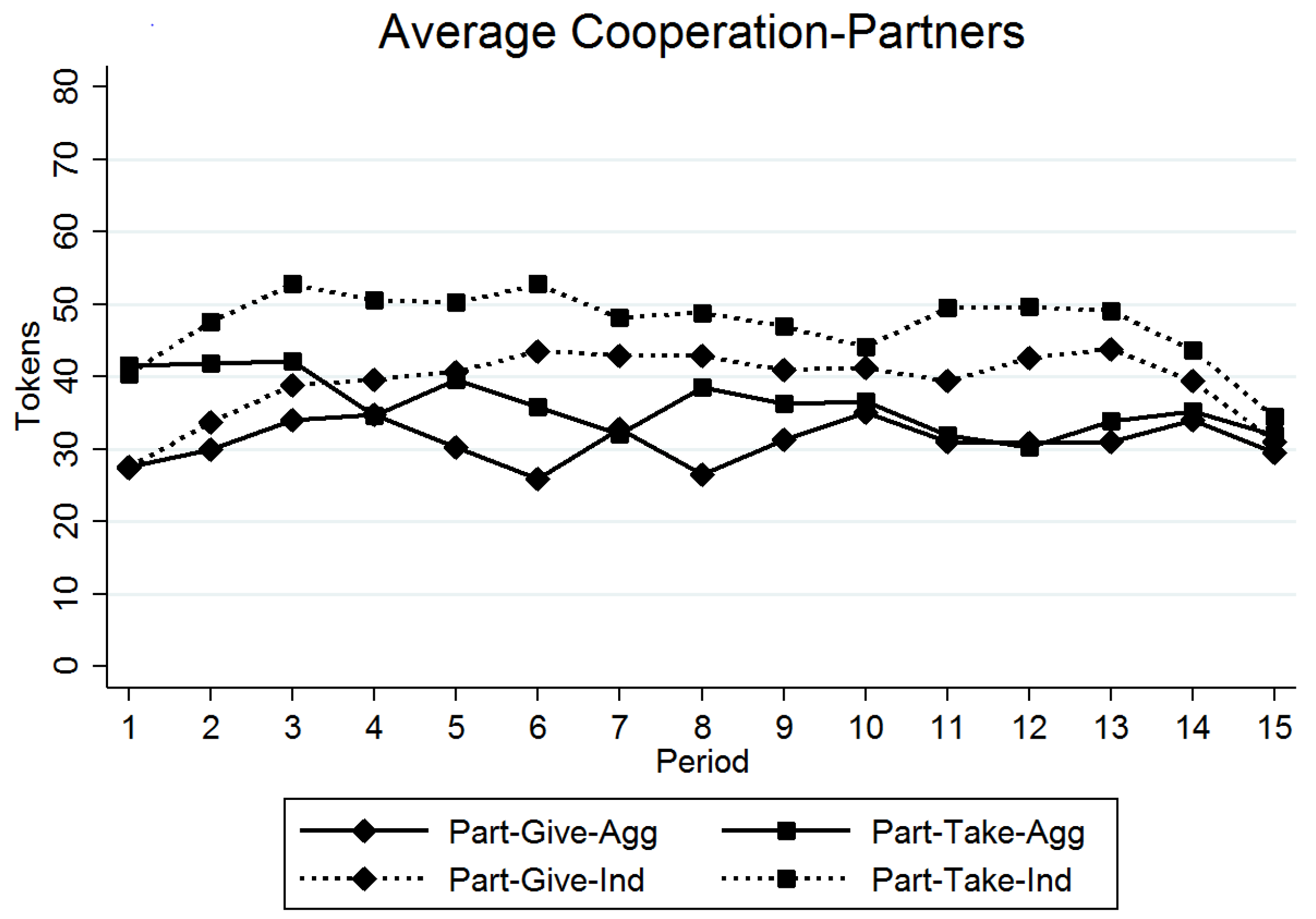 Recall the treatments are identified by matching mechanism-frame-feedback condition. For brevity in the discussion of the results, the Partners-Give-Aggregate treatment will be referred to as PGA, the Partners-Give-Individual treatment as PGI, the Partners-Take-Aggregate treatment as PTA, and the Partners-Take-Individual treatment as PTI. Similar acronyms are used for the Strangers treatments.