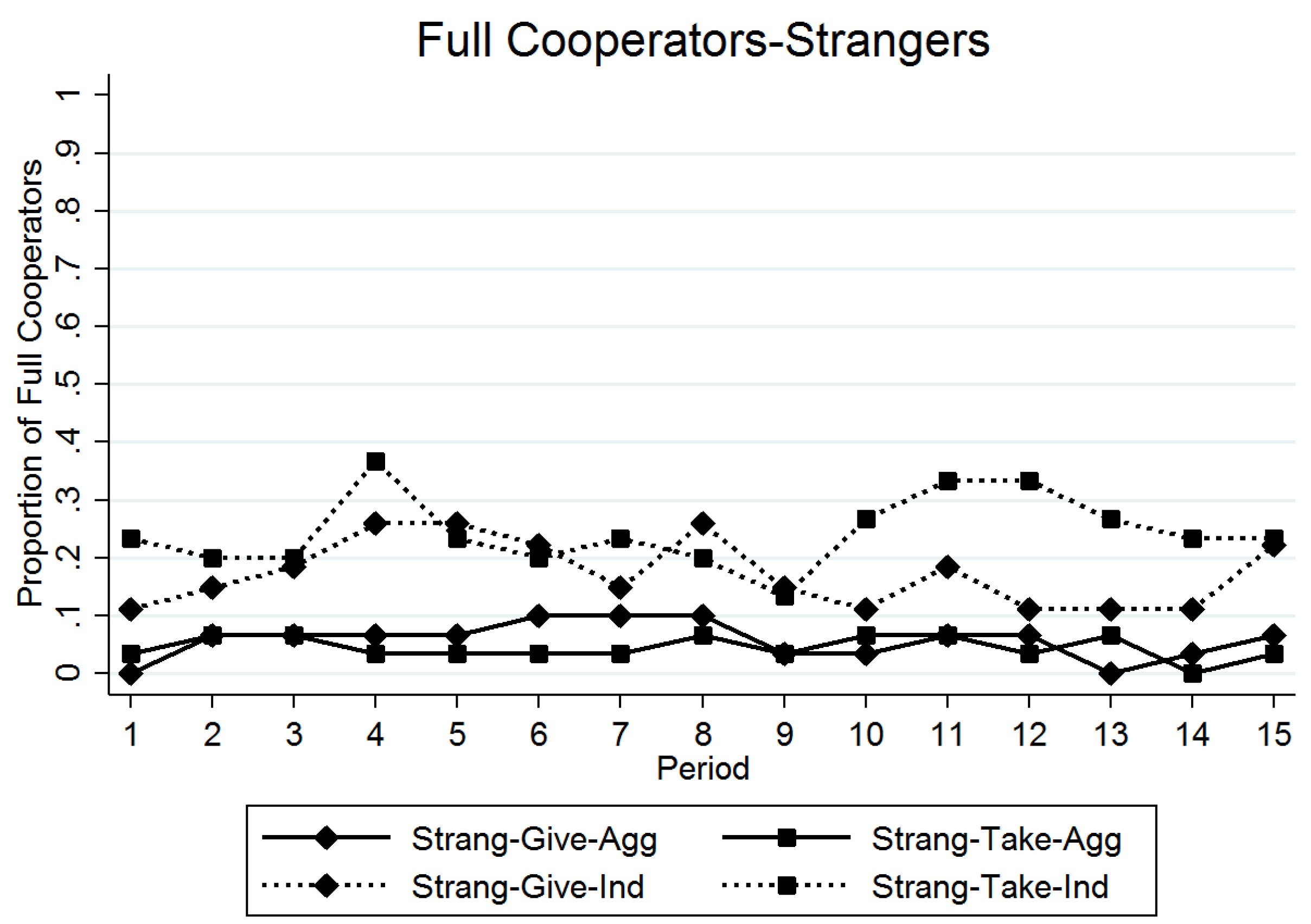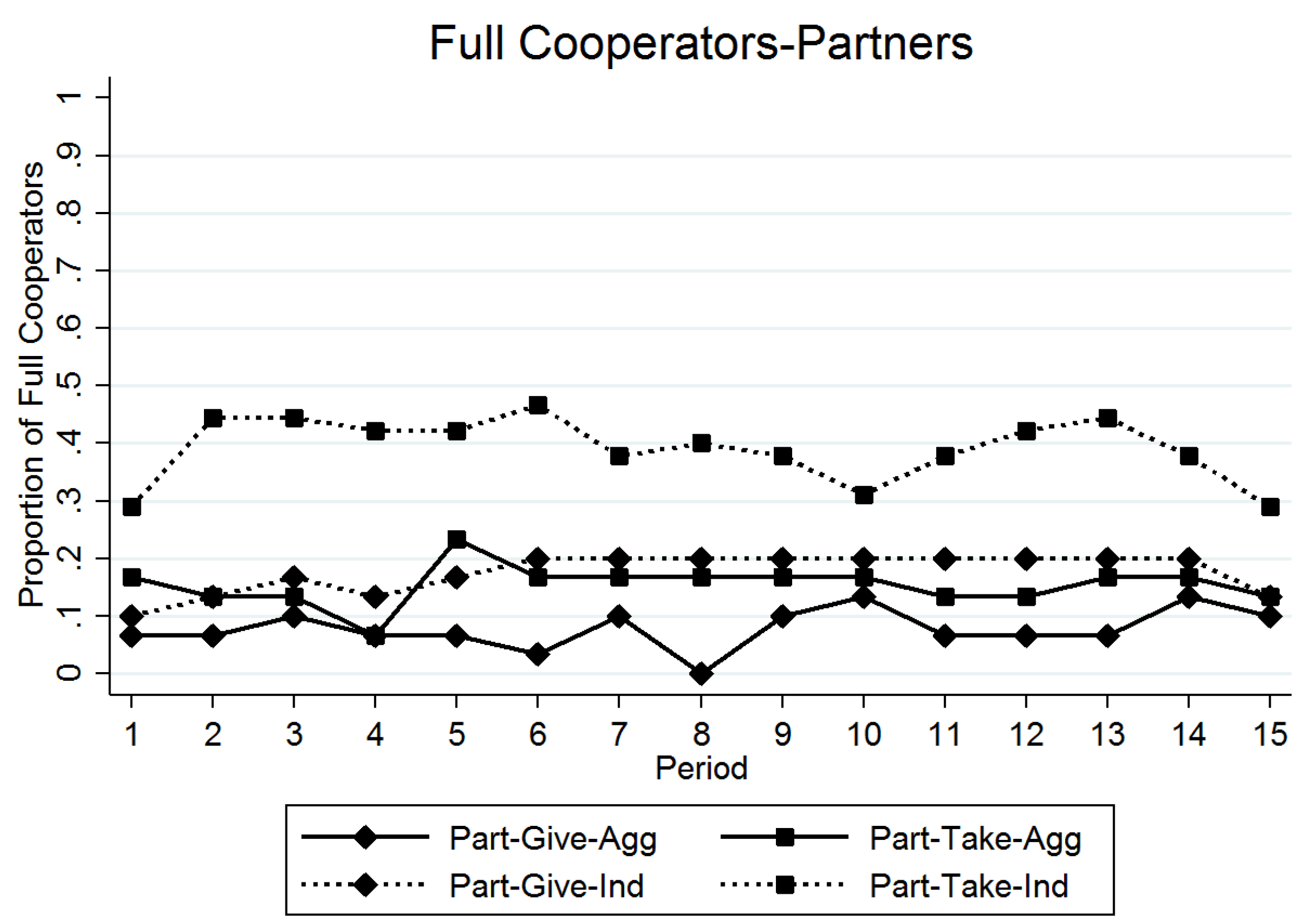 Finally, a group’s total payoff is maximized when each individual member fully cooperates (coop = 80). Figure 3 displays the path of the proportion of full cooperators for each treatment. There are not large differences in the proportions of full cooperation between treatments, except for the much higher proportion of full cooperators in the PTI treatment.