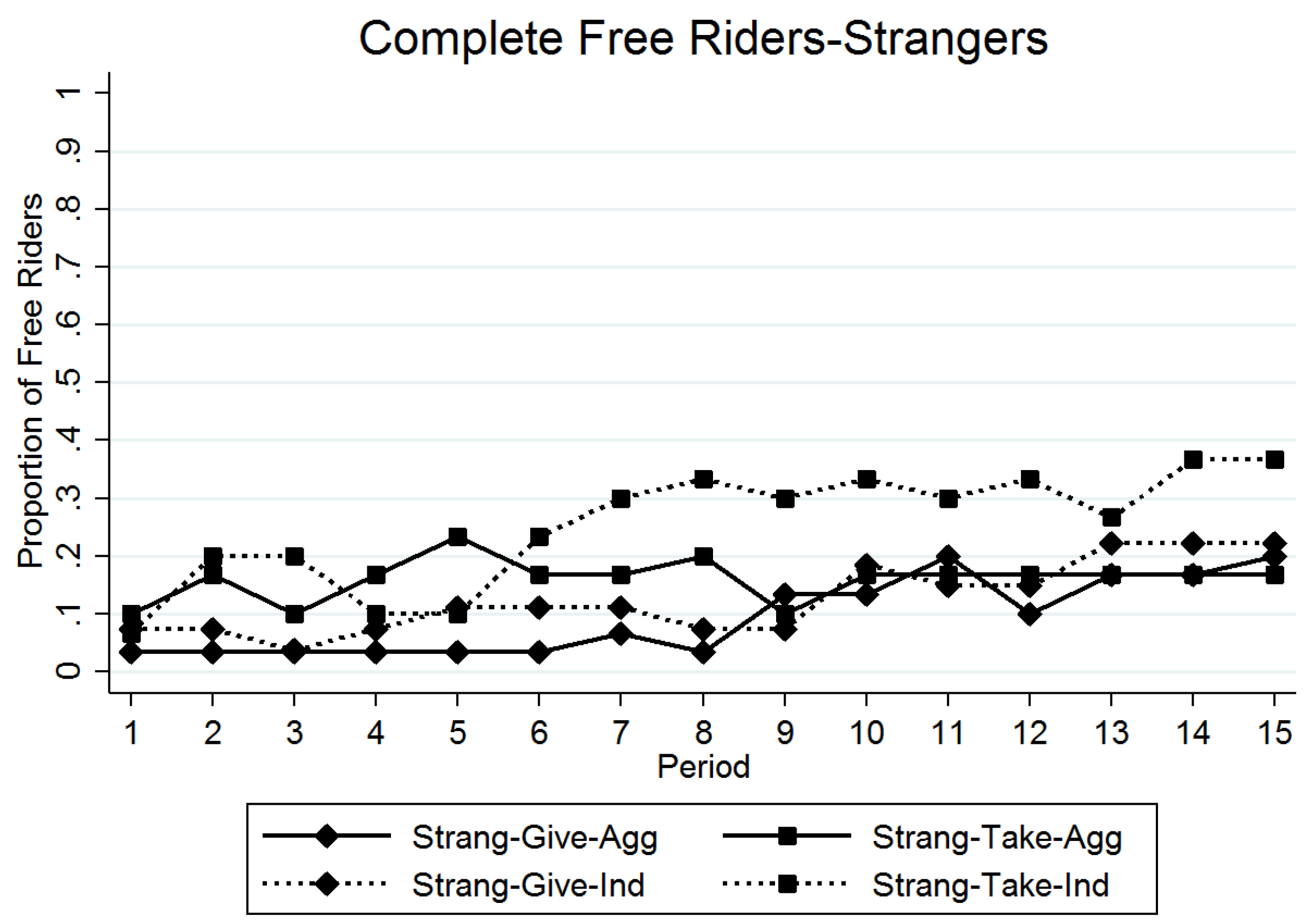 Previous research indicates average cooperation can mask a large degree of variation in cooperation decisions. Some of the variation is caused by extreme behavior of subjects, which has been shown to be sensitive to Take framing (Cox [17]) and Individual feedback (Croson [22], Kreitmair [25]). Figure 2 displays the path of the proportion of complete free riders for each treatment. Within a feedback condition, there is always a higher proportion of free riders with Take framing.