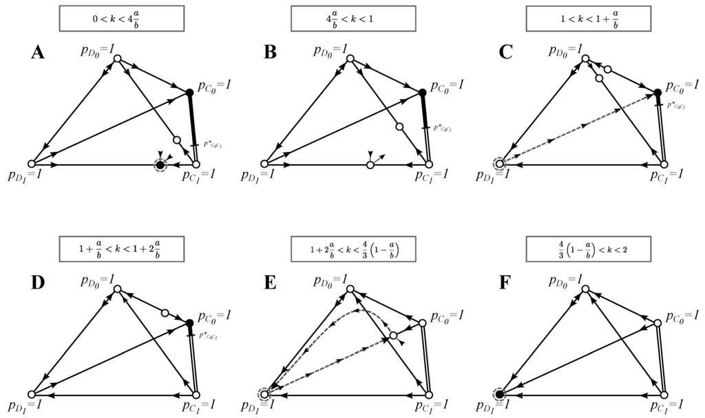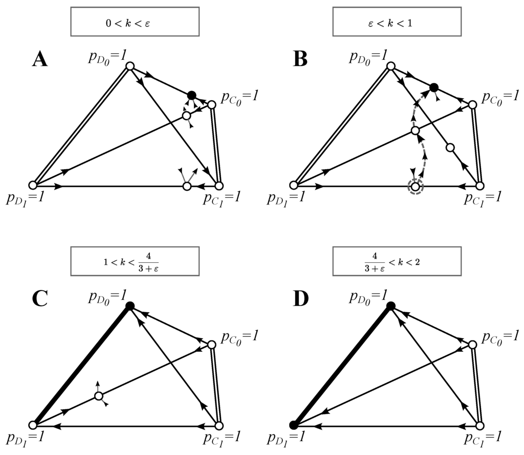 The best strategies are found by calculating the (dynamic) equilibria of system Equation (8) and analyzing their stability. Asymptotically-stable equilibria are the uninvadable strategies (ESS), and stable, but not asymptotically-stable equilibria are the best selective strategies (BSS). In our model, all BSS are stable, but not asymptotically stable, because they form a (continuous) line of equilibria, so that the dynamics is neutral in one direction of the phase plane, but asymptotically stable in all other directions. We will denote equilibrium frequencies with , such that, for example, denotes an equilibrium where only strategies and have strictly positive frequencies. If there is more than one equilibrium, we enumerate them.