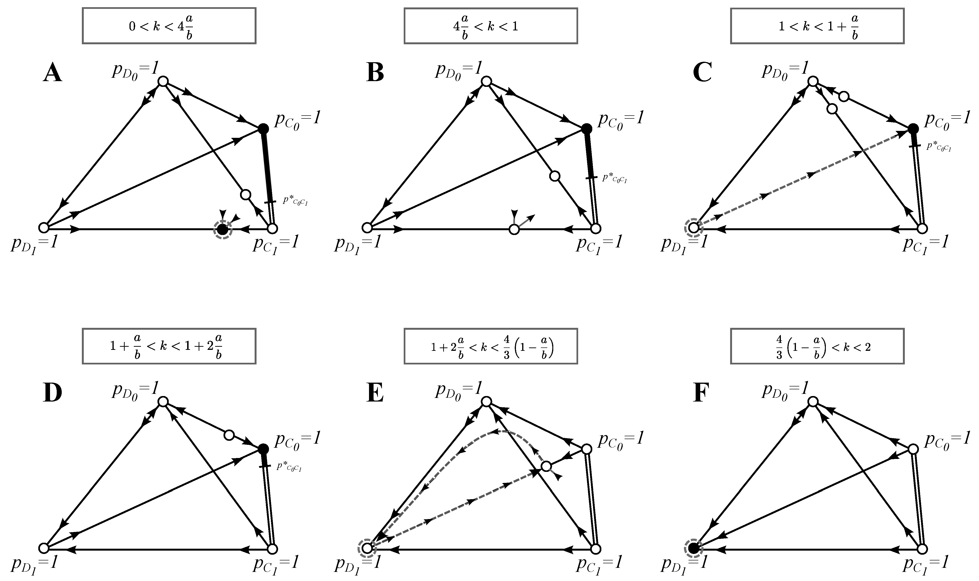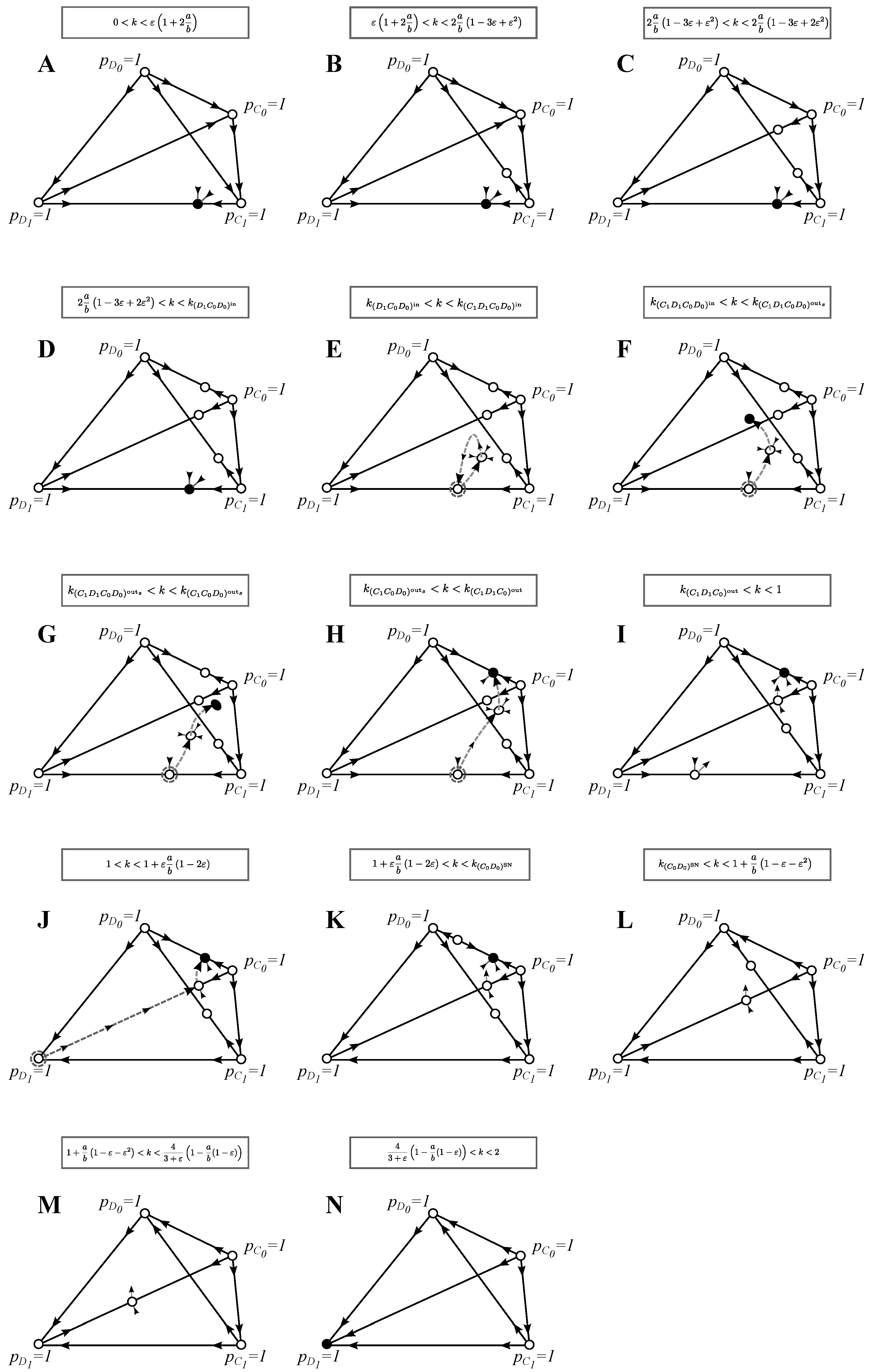 Phase plane analysis for the full model: Similarly to Figure 3, in order to reduce the number of panels, we draw separate phase planes only for qualitatively different best strategy solutions or invasion-substitution sequences and when the stability of the monomorphic equilibria changes. In contrast to previous models, trimorphic and four-morphic ESS solutions were found, see (G) and (F), respectively. As before, we only draw the invasion-substitution sequences that are qualitatively different from the ones presented in previous figures. See Section 3.4 for the discussion of the evolutionary properties of this model and the Appendix for further analysis.