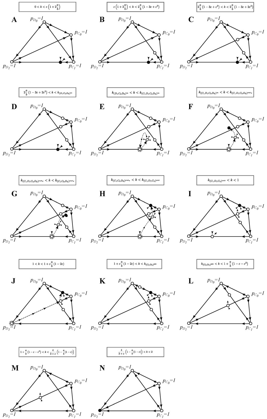 Phase-plane analysis for the model with search costs: see Figure 1 for explanations. In this model, we draw separate phase planes only for qualitatively different best strategy solutions or invasion-substitution sequences and when the stability of the monomorphic equilibria changes. Similarly to Figure 2, arrows are not drawn for the dimorphic equilibria (equilibria on the edges) that are not best strategy solutions or that do not affect the invasion substitution sequence. Trimorphic equilibria that are not the best strategy solutions or that do not affect the invasion-substitution sequence are not drawn at all. We found no four-morphic equilibria. As before, we only draw the invasion-substitution sequences that are qualitatively different from the ones presented in previous figures. See Section 3.3 for the discussion of the evolutionary properties of this model and the Appendix for further analysis.