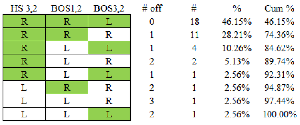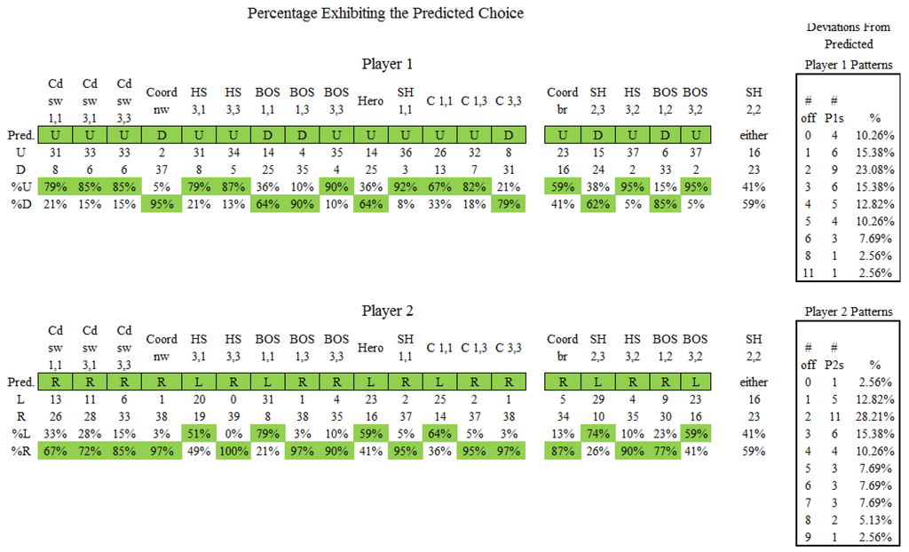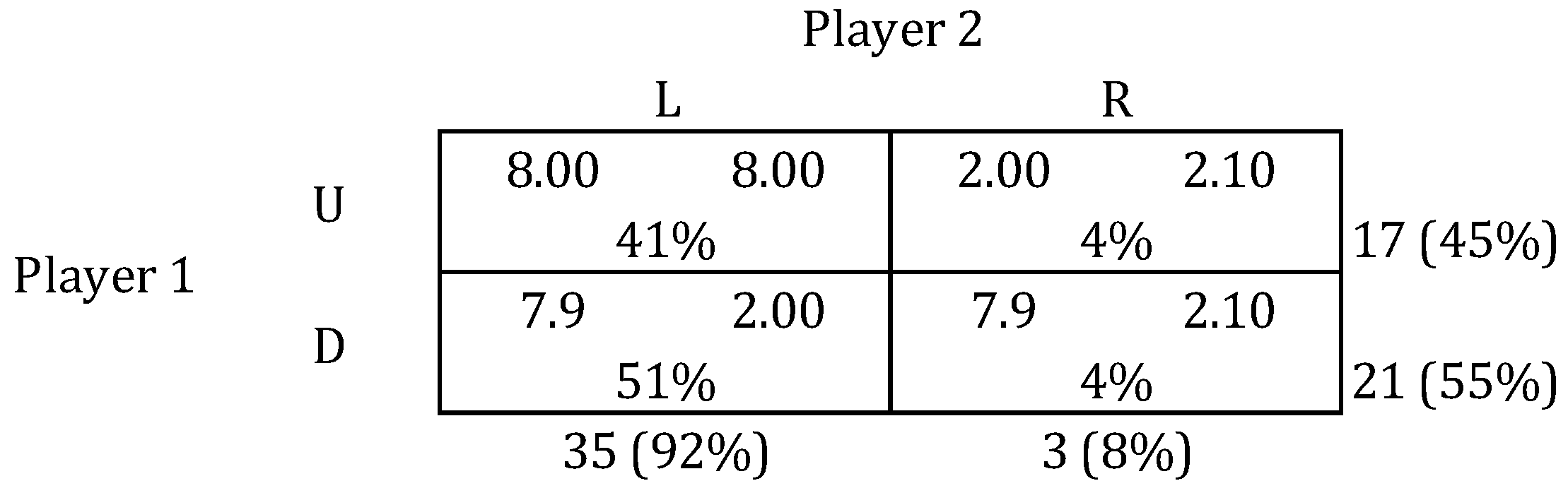 - 15It is not quite clear what a mixed strategy means in the context of a single-shot game. However, if players did randomize optimally given the payoff matrices, we would expect 81% of the outcomes in 1,1 to be DR (rather than the 12% observed), 81% of the outcomes in 1,3 to be UL (rather than the 4% observed) and 81% of the outcomes in 3,3 to be UR (rather than the 20% observed.)