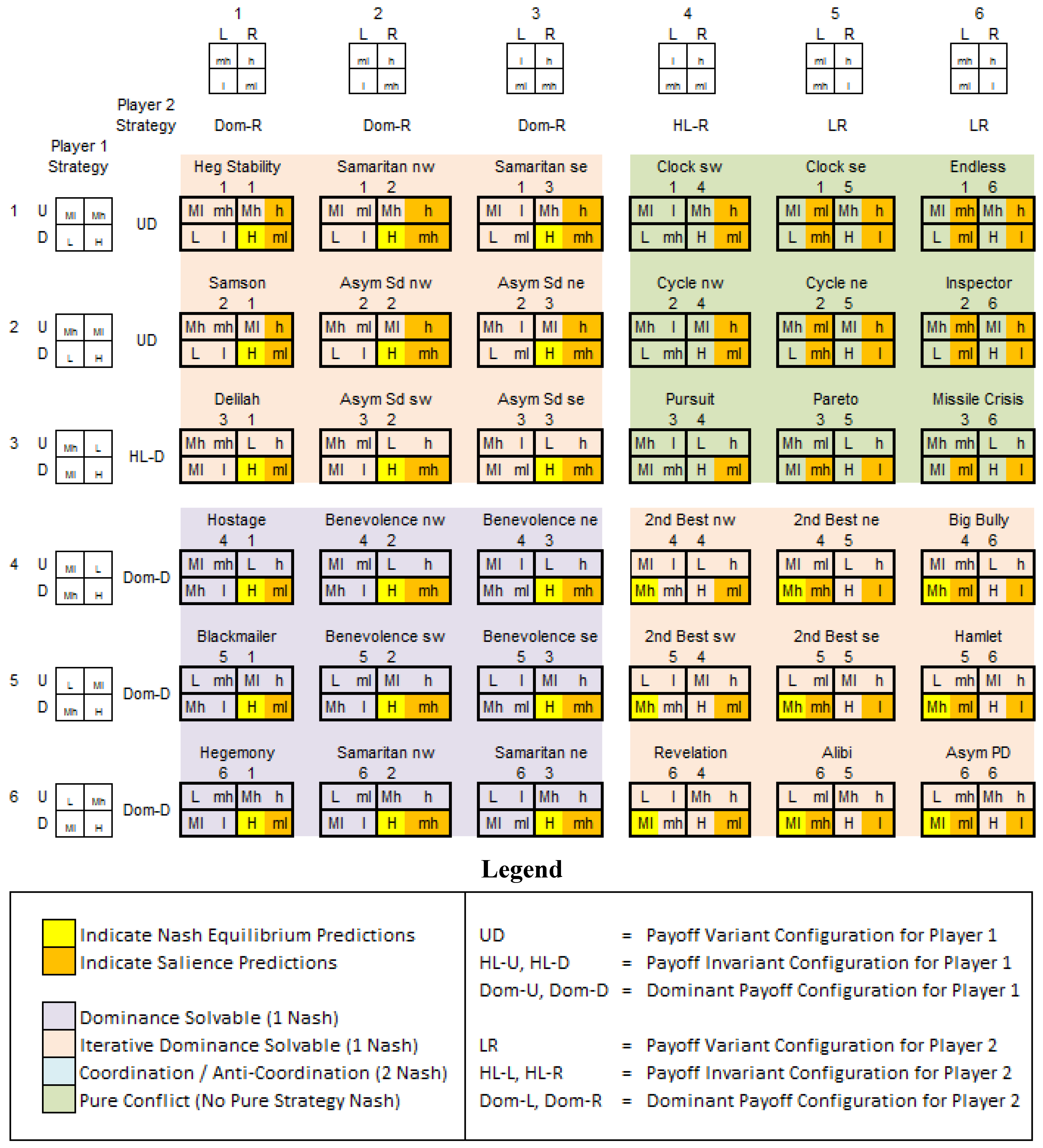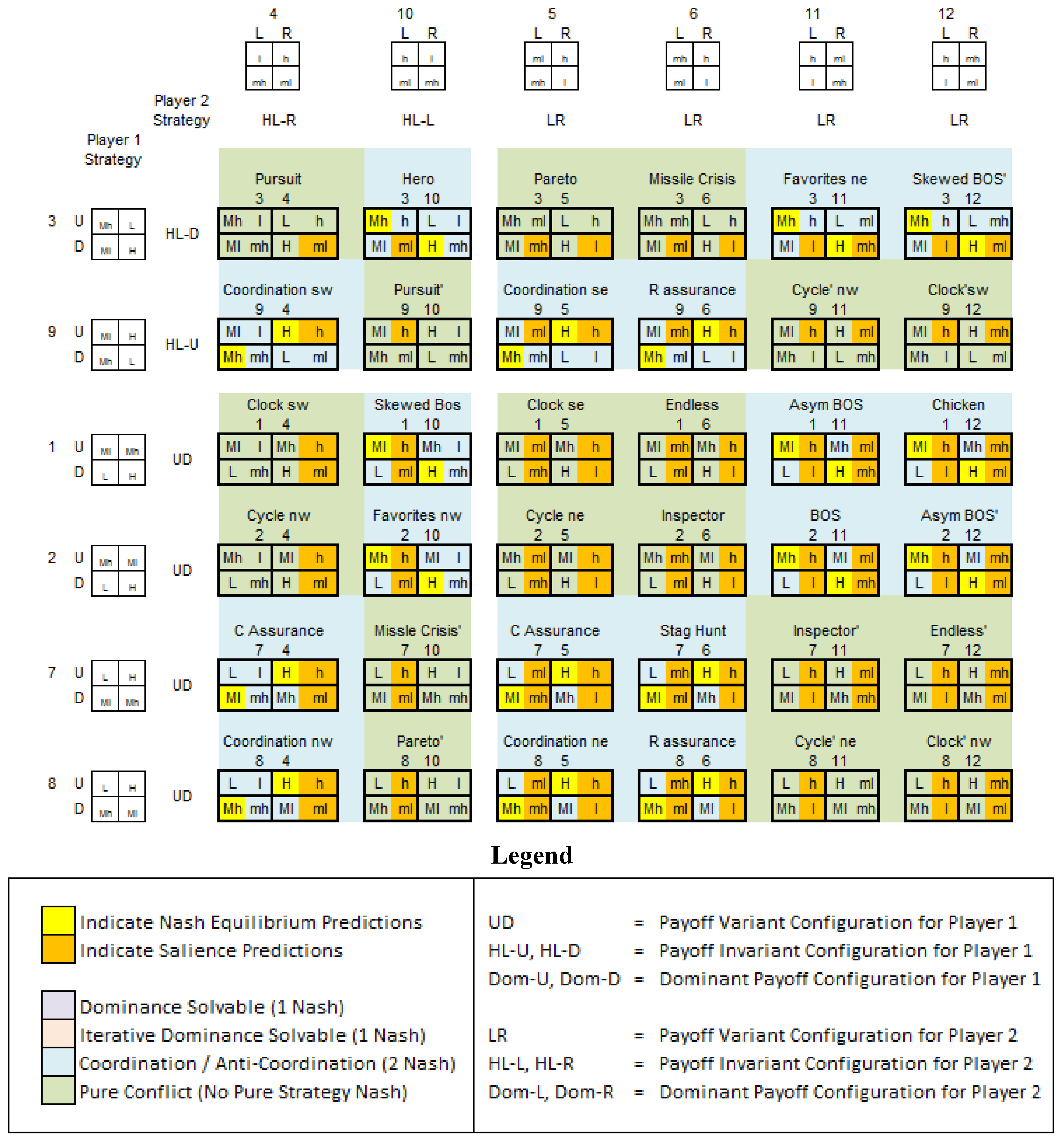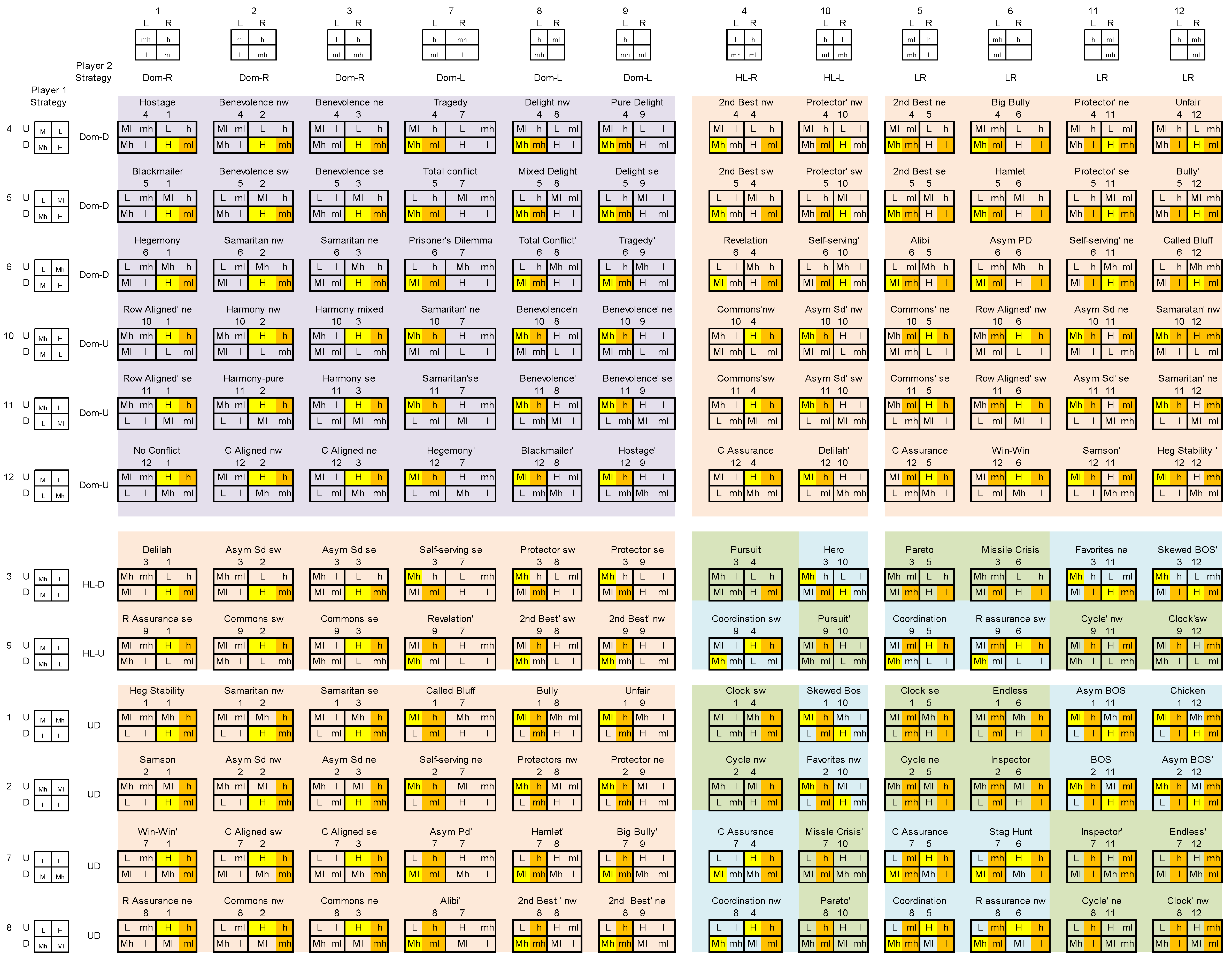 In Robinson and Goforth’s typology there are 12 possible payoff structures for each player. For six of these, there is a dominating strategy so 36 of the games are solved by dominance. The games where both players have dominating strategies are the ones clustered in purple. According to game theory, the outcome in these will be the dominating Nash equilibrium (where here and throughout the figures in Section 2, Nash equilibria are indicated by yellow cells containing a payoff in bold.) An additional 72 games are dominance solvable—one player has a dominating strategy and the other best responds. These are the clusters of games shaded in beige. The two clusters of games in blue involve payoff configurations that produce coordination and anti-coordination games, respectively. For these games, traditional game theory predicts that one of the two Nash outcomes will obtain but does not specify which will occur. Finally, there are two clusters of games in green. These are cyclic games for which game theory makes no pure strategy predictions.