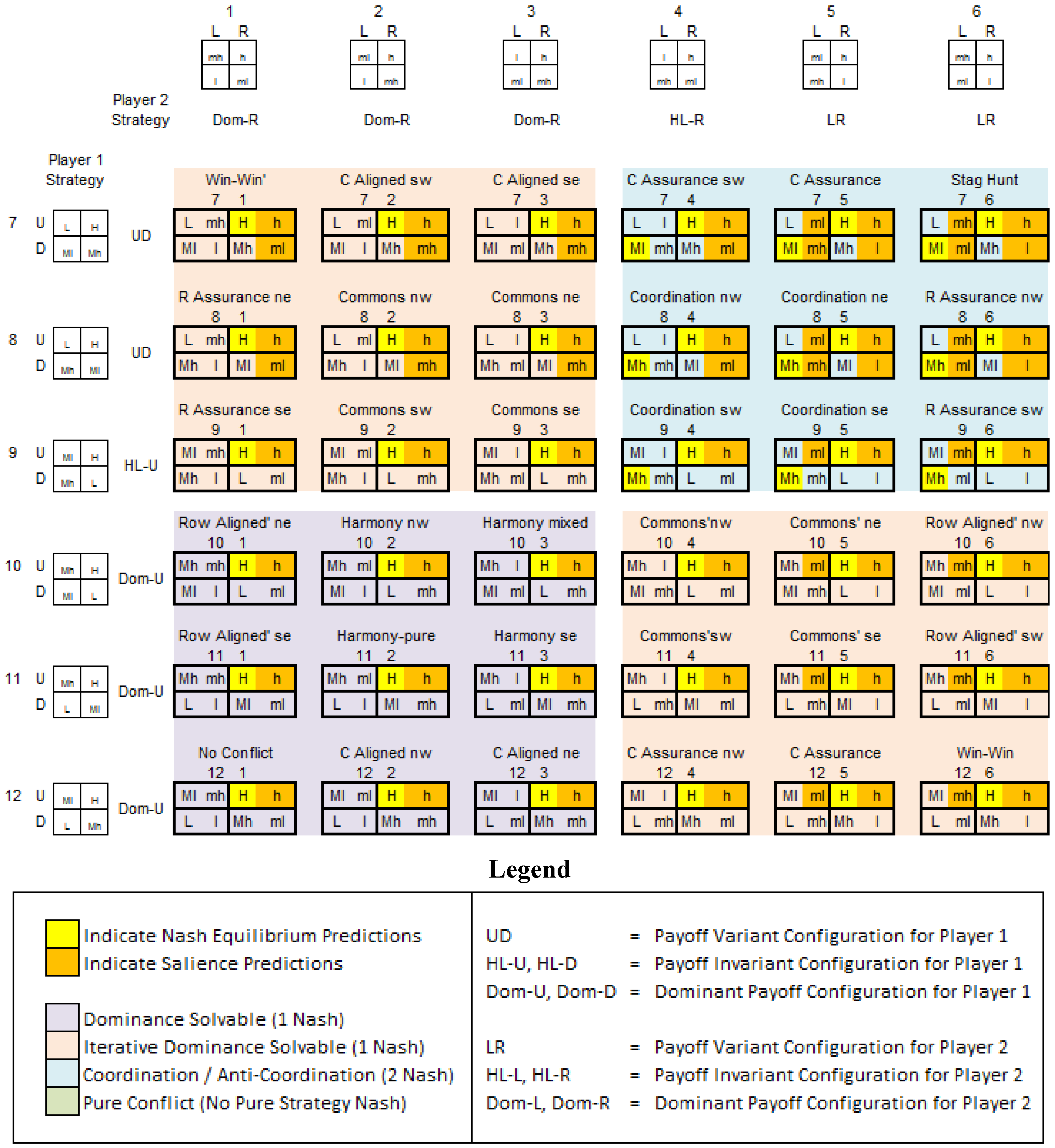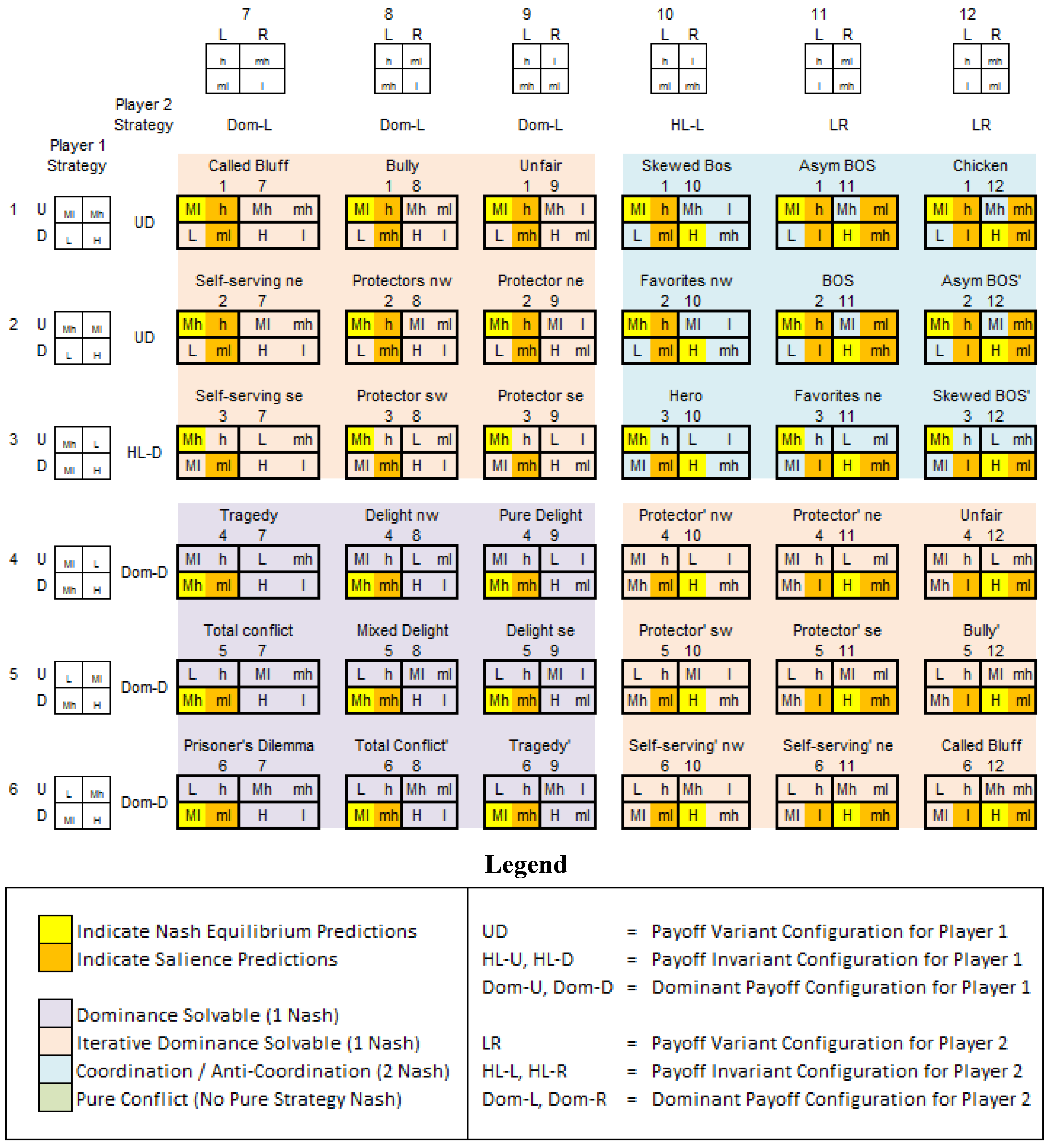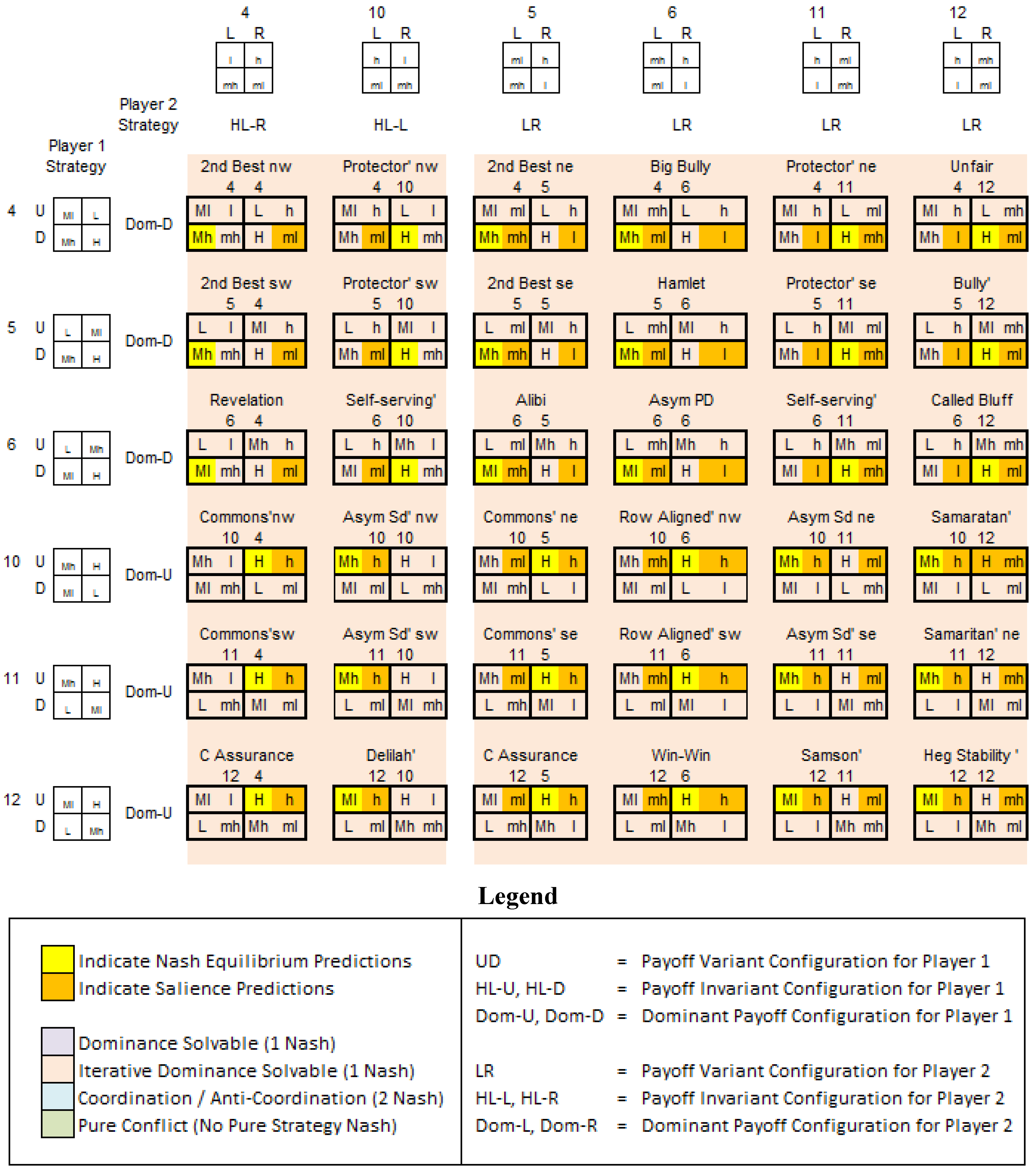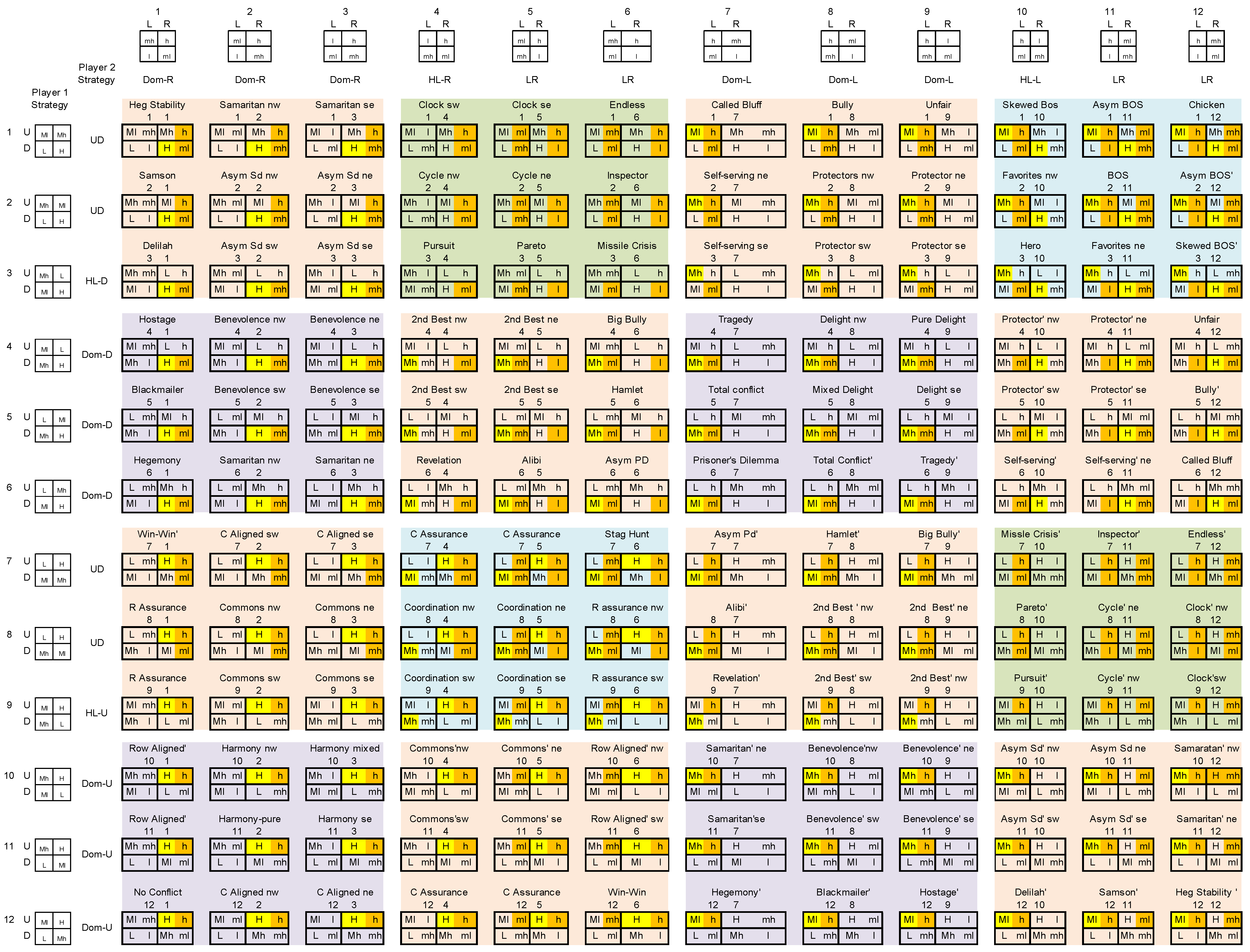 In Robinson and Goforth’s typology there are 12 possible payoff structures for each player. For six of these, there is a dominating strategy so 36 of the games are solved by dominance. The games where both players have dominating strategies are the ones clustered in purple. According to game theory, the outcome in these will be the dominating Nash equilibrium (where here and throughout the figures in Section 2, Nash equilibria are indicated by yellow cells containing a payoff in bold.) An additional 72 games are dominance solvable—one player has a dominating strategy and the other best responds. These are the clusters of games shaded in beige. The two clusters of games in blue involve payoff configurations that produce coordination and anti-coordination games, respectively. For these games, traditional game theory predicts that one of the two Nash outcomes will obtain but does not specify which will occur. Finally, there are two clusters of games in green. These are cyclic games for which game theory makes no pure strategy predictions.